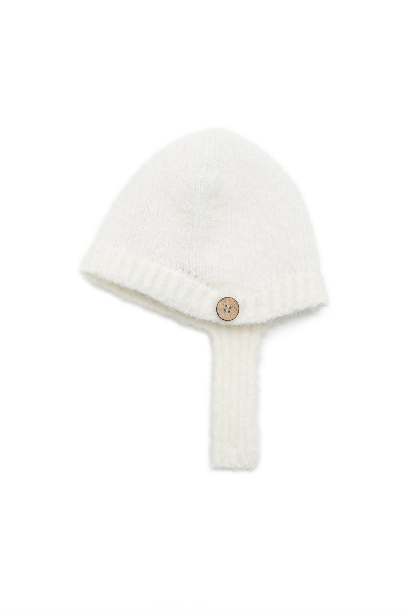 Трикотажный чепчик с застежкой на пуговицу. Модель выполнена из шерсти с добавлением мохера, края изделия в рубчик.