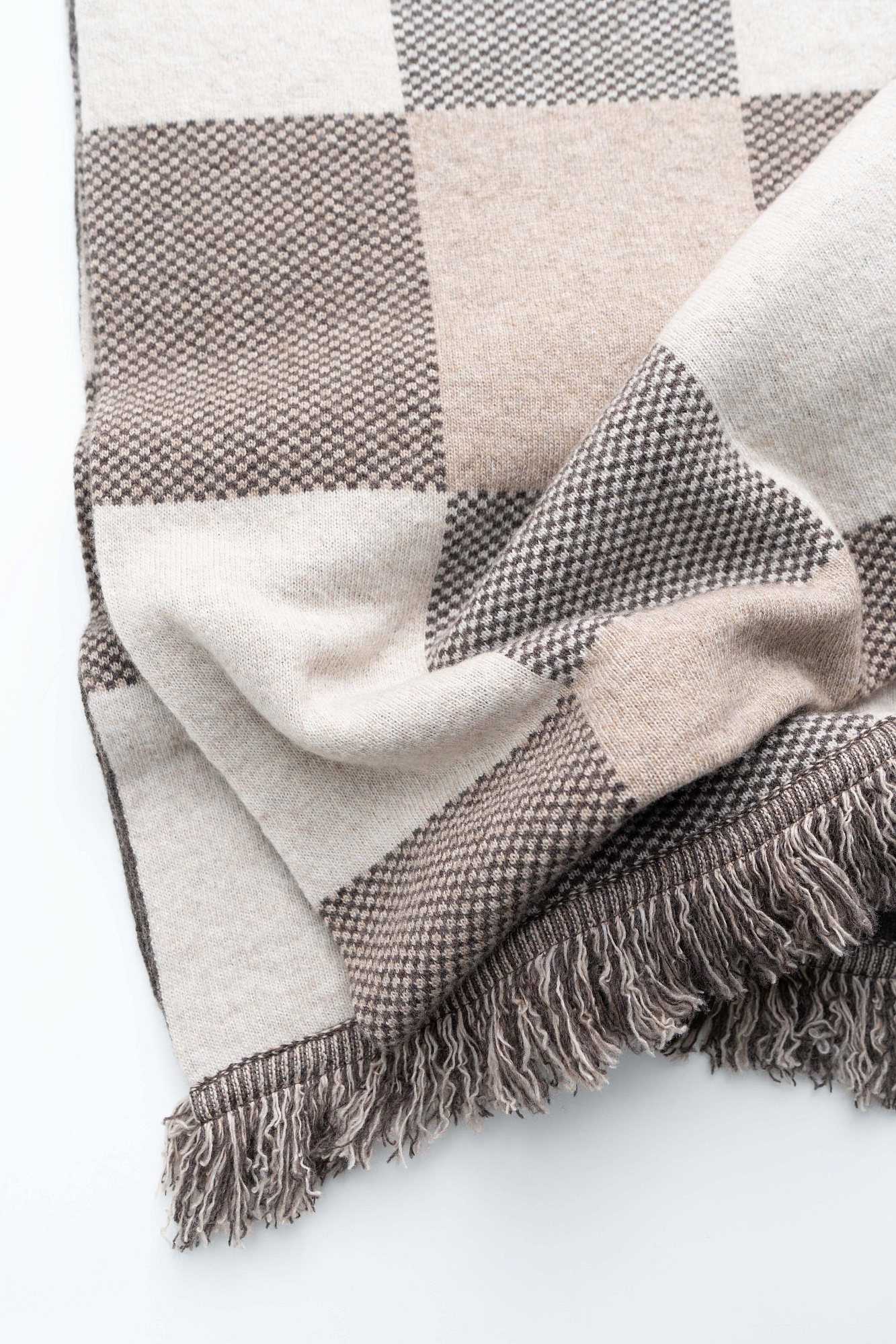 Трикотажный палантин из кашемира. Модель в клетку с бахромой по краям.