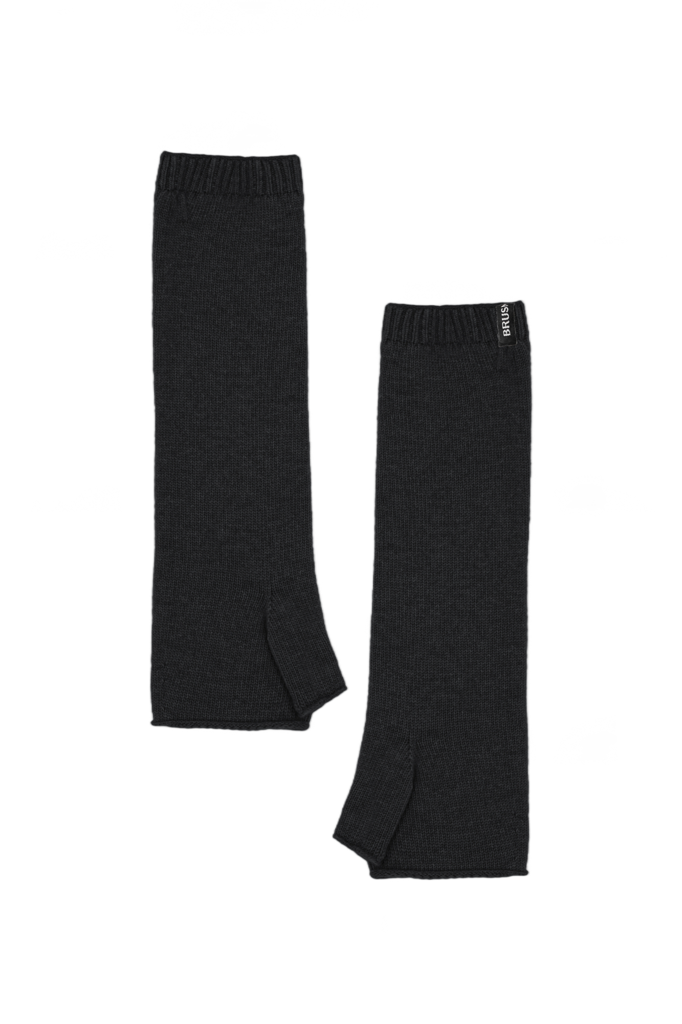 Трикотажные митенки из шерсти с добавлением кашемира. Модель с валиком по краю, эластичной резинкой в рубчик и брендированной биркой.
