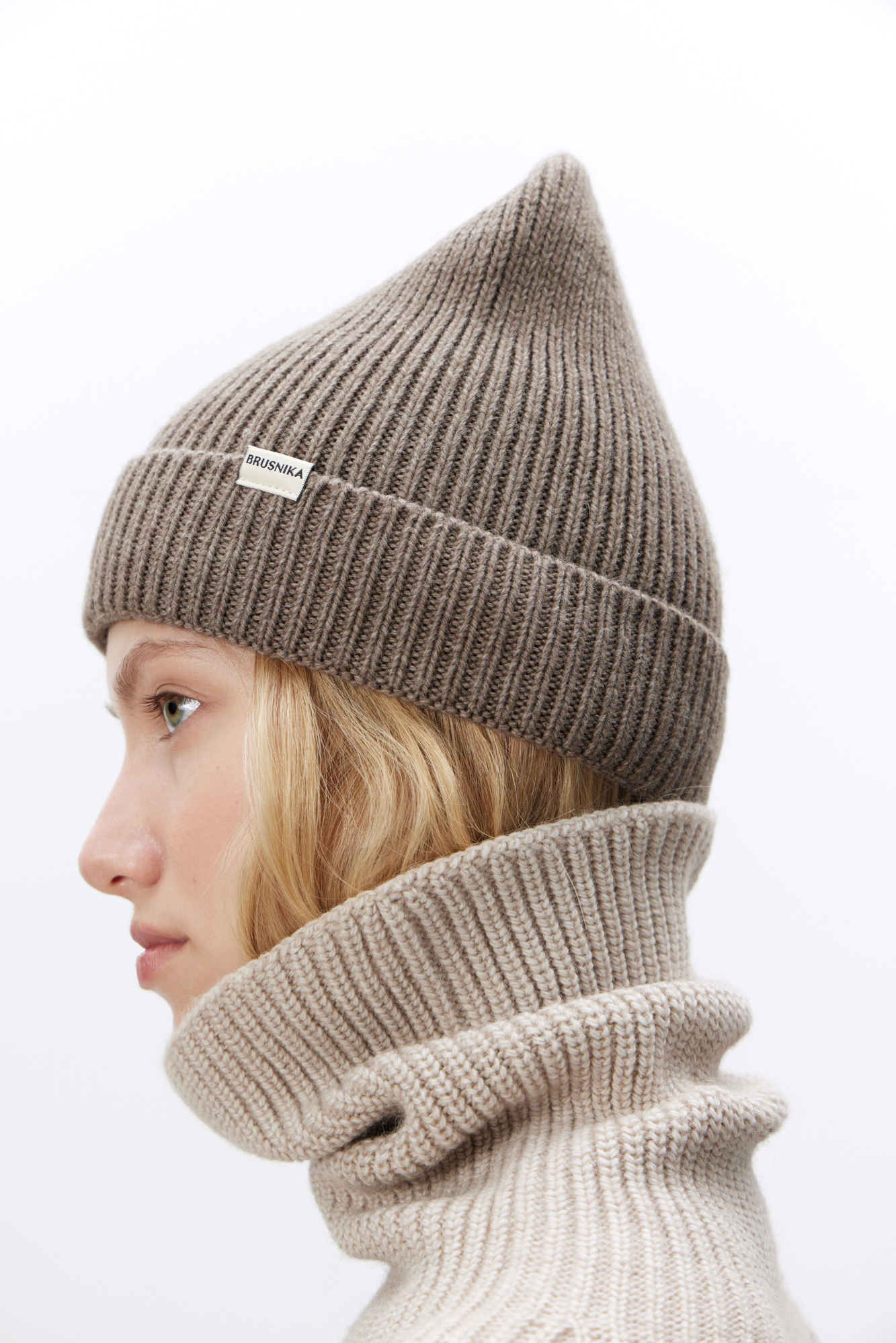 Трикотажная шапка в мелкий рубчик с отворотом из смесовой шерсти с добавлением шерсти альпака.