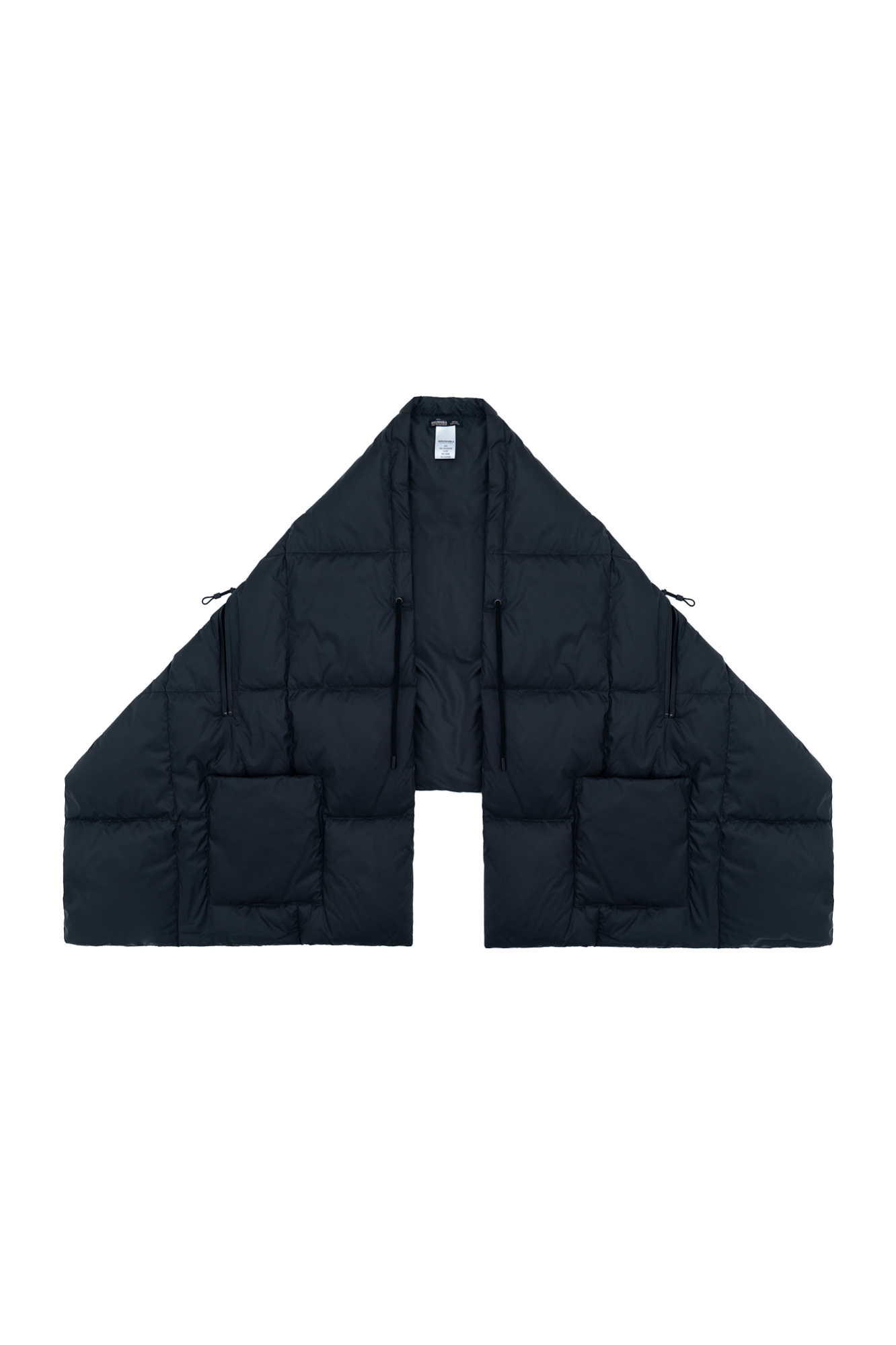 Палантин-жилет с накладными карманами. Регулируемая кулиска на вороте. Изделие выполнено с прорезями для рук на молнии. Наполнитель натуральный пух 90% перо 10%.