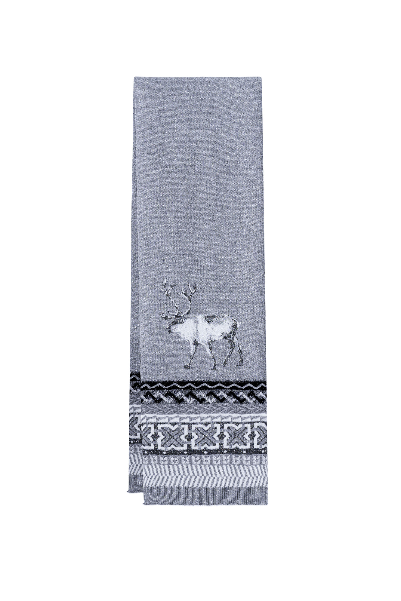 Трикотажный шарф с добавлением кашемира с жаккардовым узором в виде оленей и орнамента. Изделие декорировано люрексом.