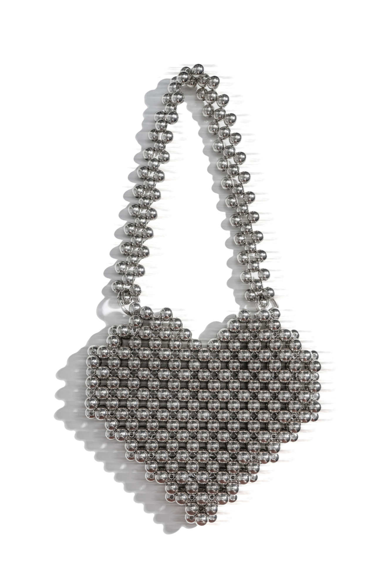 Сумочка в виде сердечка. выполненная путем переплетения металлических бусин одинакового диаметра. Модель с одной короткой ручкой на карабинах. Высота изделия составляет 16 см, длина ручек - 26 см.