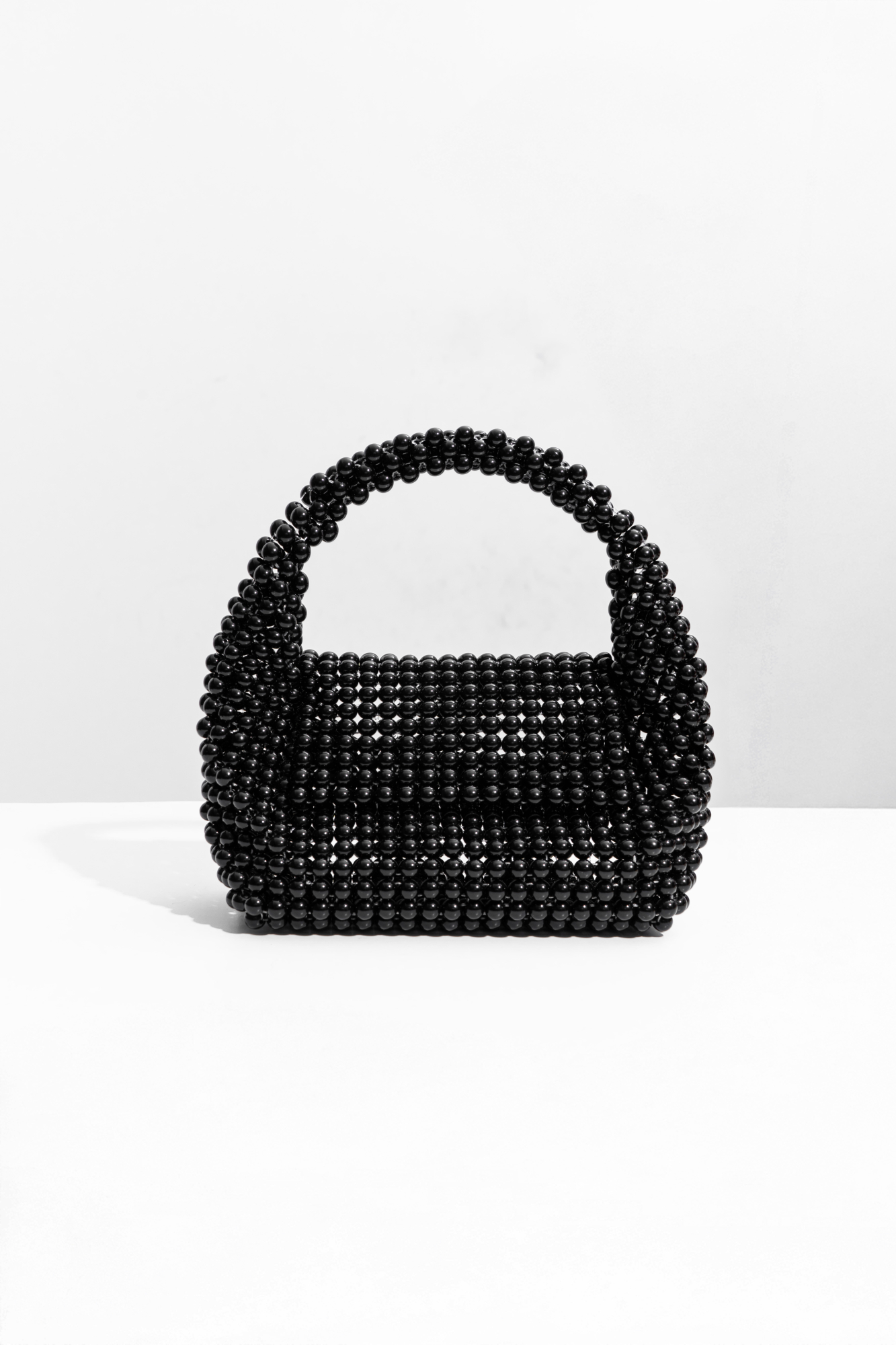 Сумочка, выполненная путем переплетения черных круглых бусин. Модель с одной ручкой. Высота изделия составляет 15 см, длина ручки - 13 см.