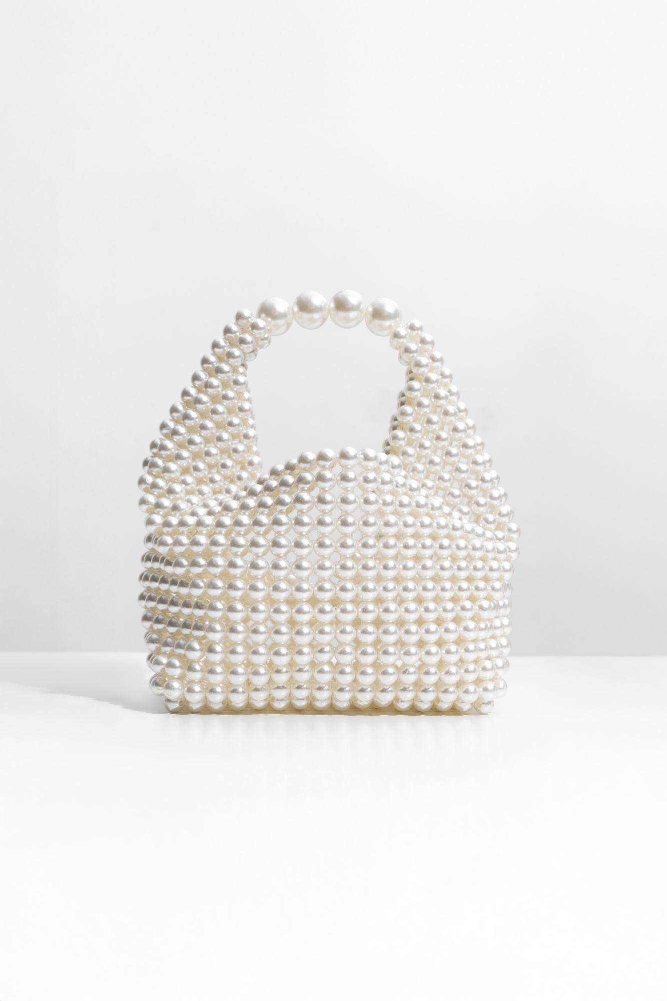 Сумочка, изготовленная путем переплетения жемчужных бусин разного диаметра. Модель с одной короткой ручкой и черным бантом в комплекте. При желании ленту можно снять. Высота изделия составляет 12 см, длина ручки - 11 см.