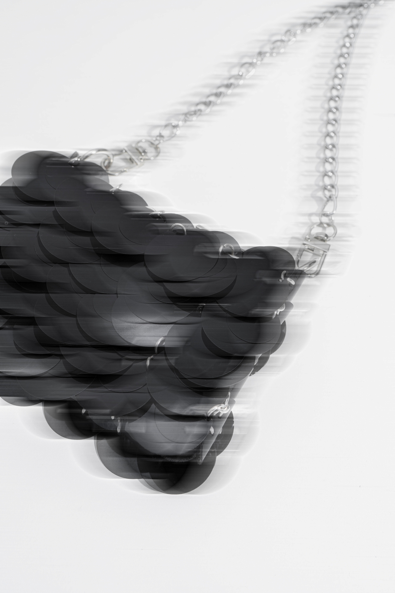 Сумочка, декорированная крупными черными пайетками. Модель на длинном ремешке-цепочке. Высота изделия составляет 9 см, длина цепочки - 117 см.