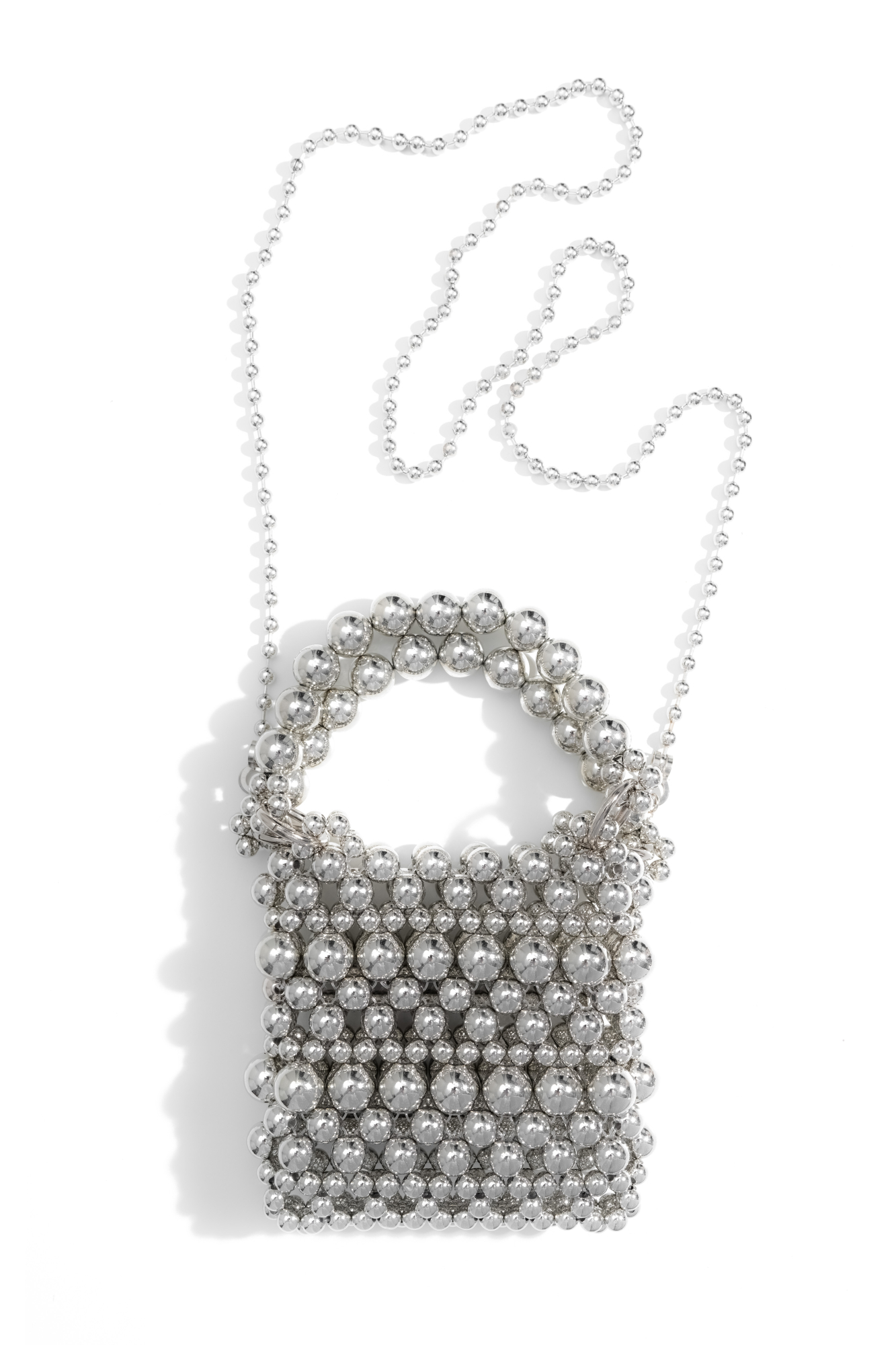 Сумочка, изготовленная путем переплетения бусин разного диаметра. Модель с двумя короткими ручками и ремешком-цепочкой. Высота изделия составляет 12 см, высота ручек - 12 см, длина цепочки - 111 см.