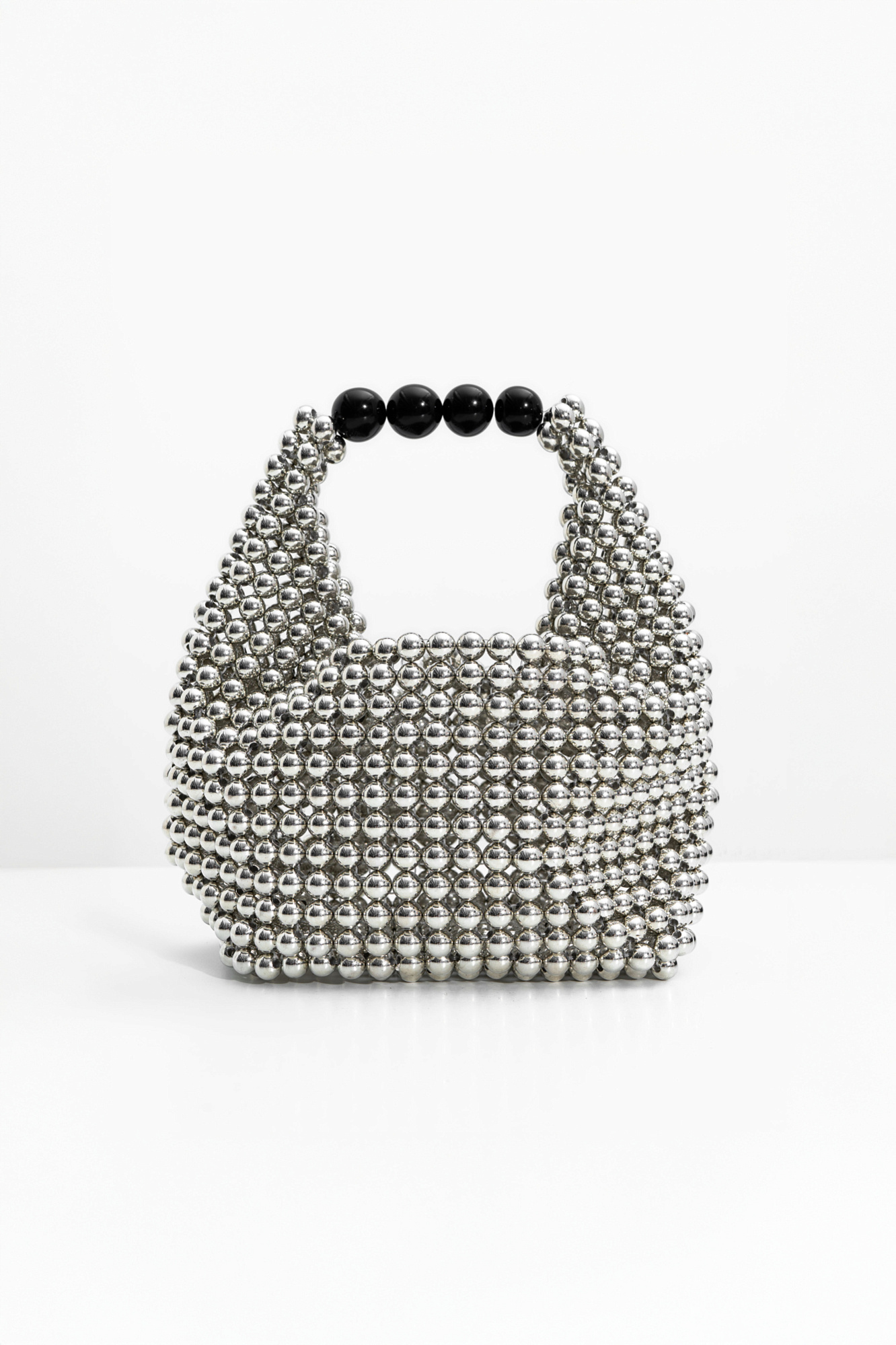 Сумочка, изготовленная путем переплетения серебряных бусин. Модель с одной короткой ручкой и черным бантом в комплекте. Высота изделия составляет 12 см, длина ручки - 13 см.