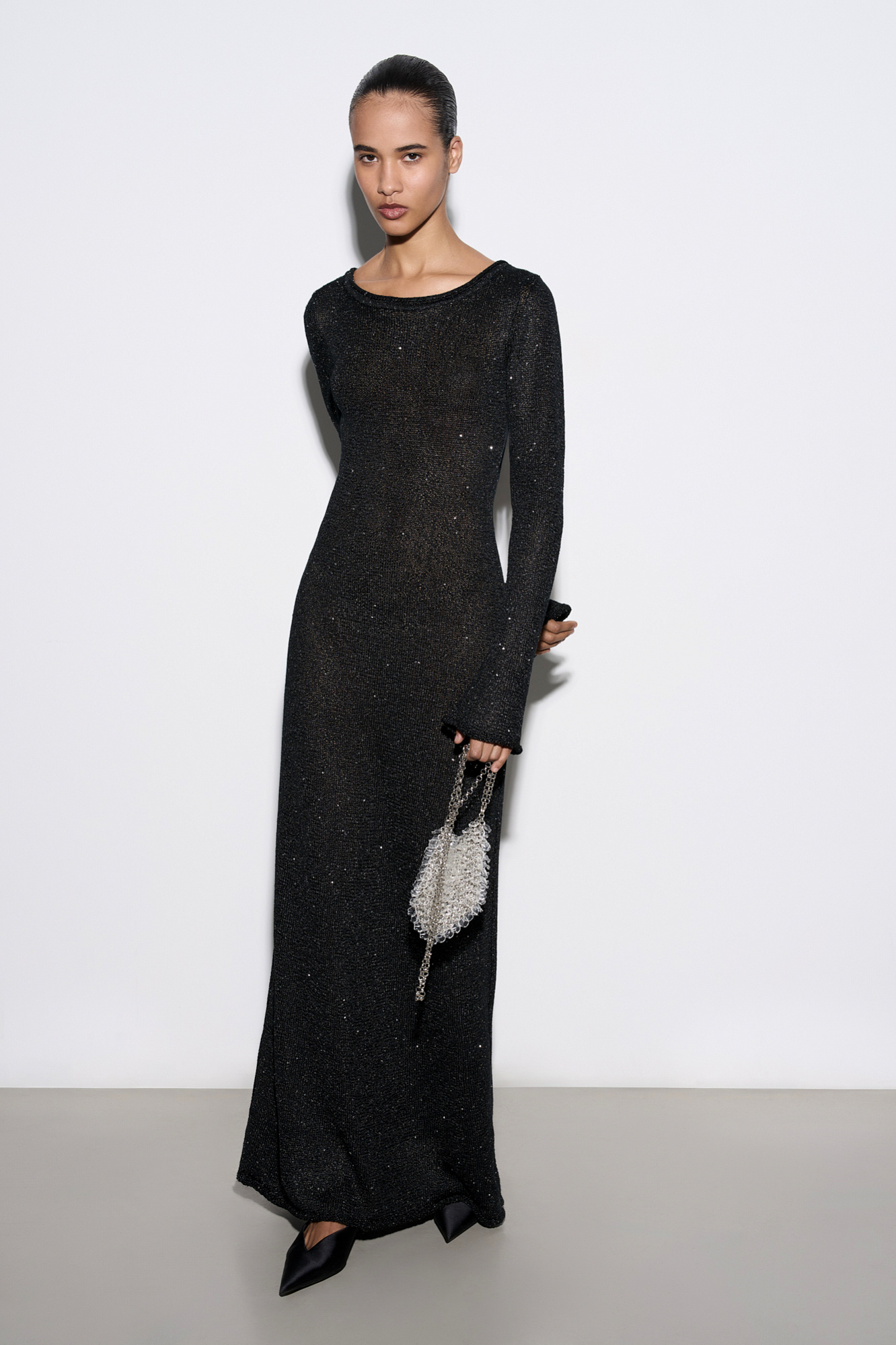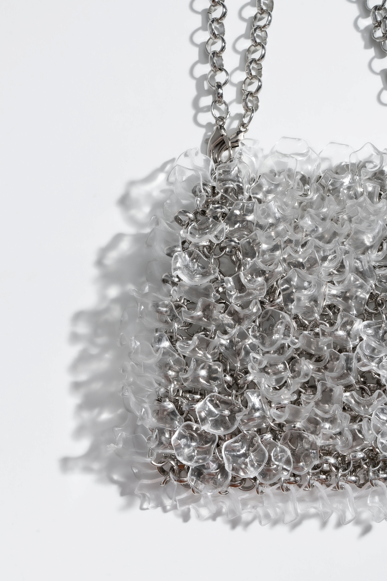 Сумочка, выполненная путем переплетения металлических колец и декорированная прозрачными бусинами неправильной формы. Модель с двумя ремешками-цепочками на карабинах. Высота изделия составляет 12 см, длина ручки - 12 см, длина цепочки - 109 см.