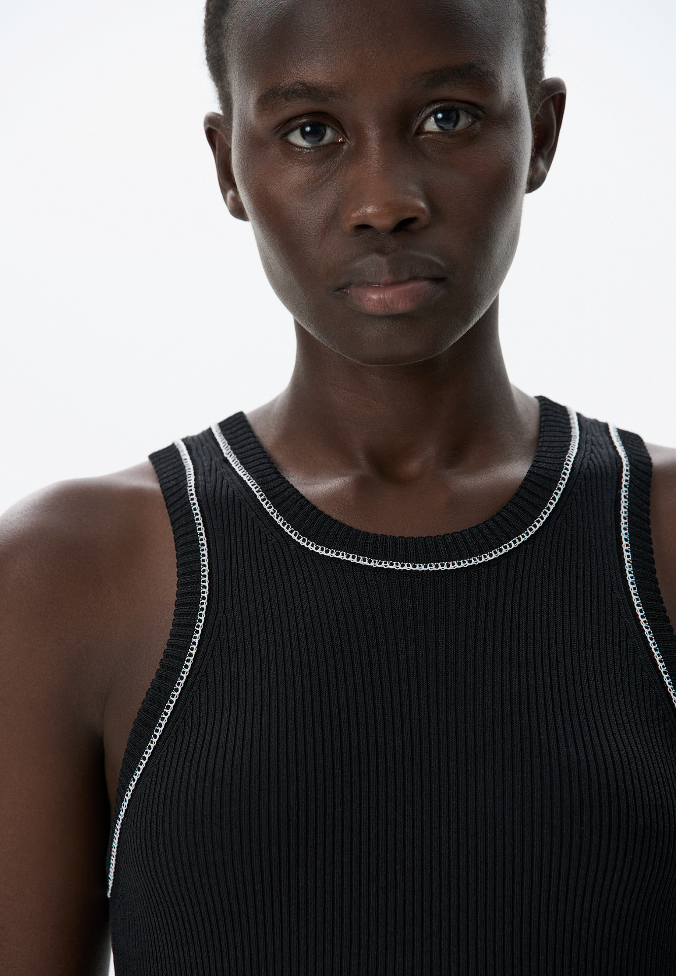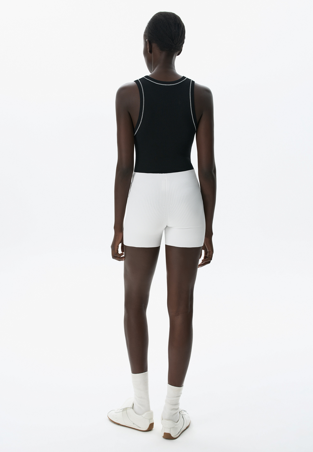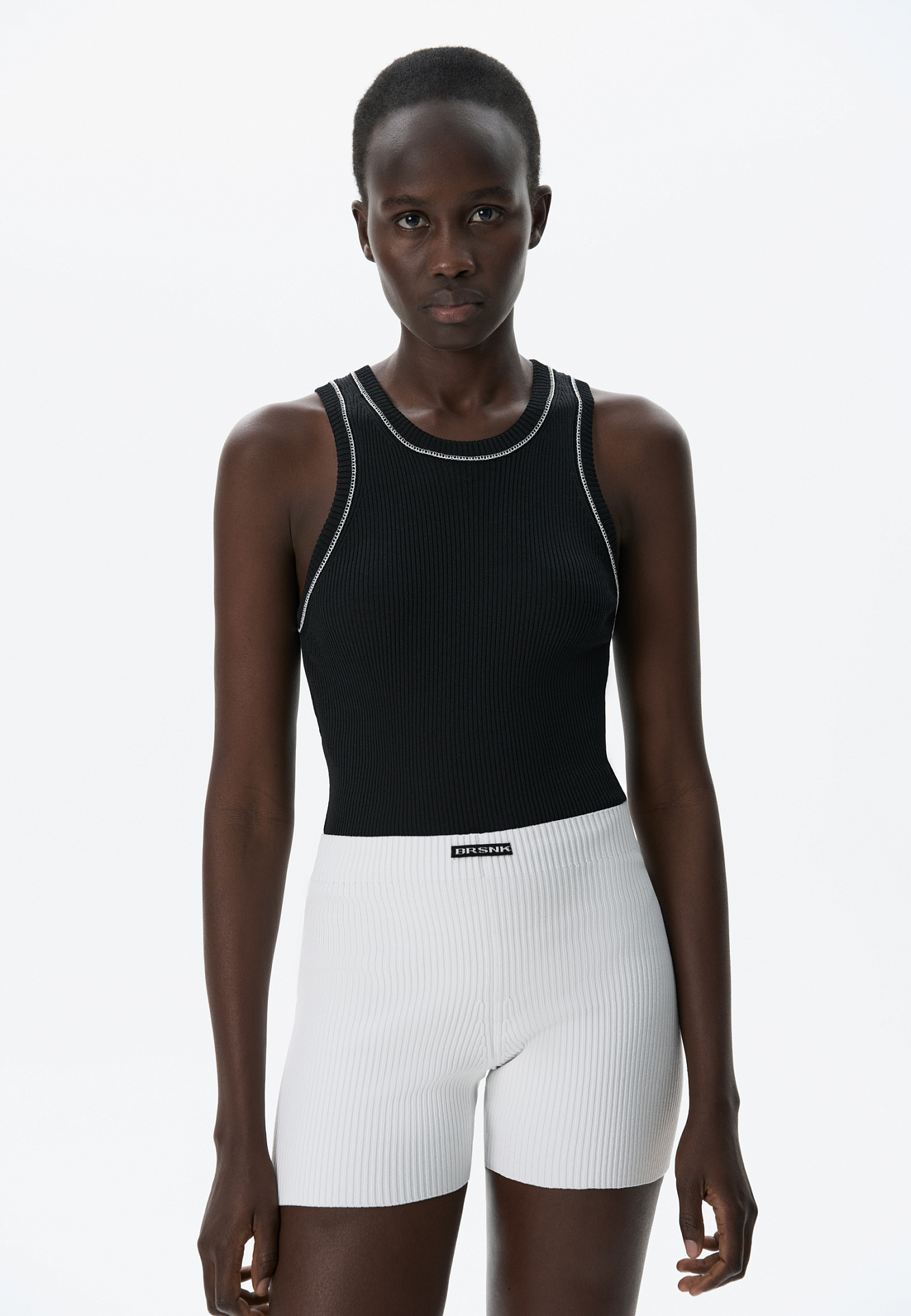 Трикотажное боди из вискозы в рубчик. Модель без рукавов с круглым вырезом горловины. Изделие декорировано контрастным кантом. Застежка на бельевые крючки.