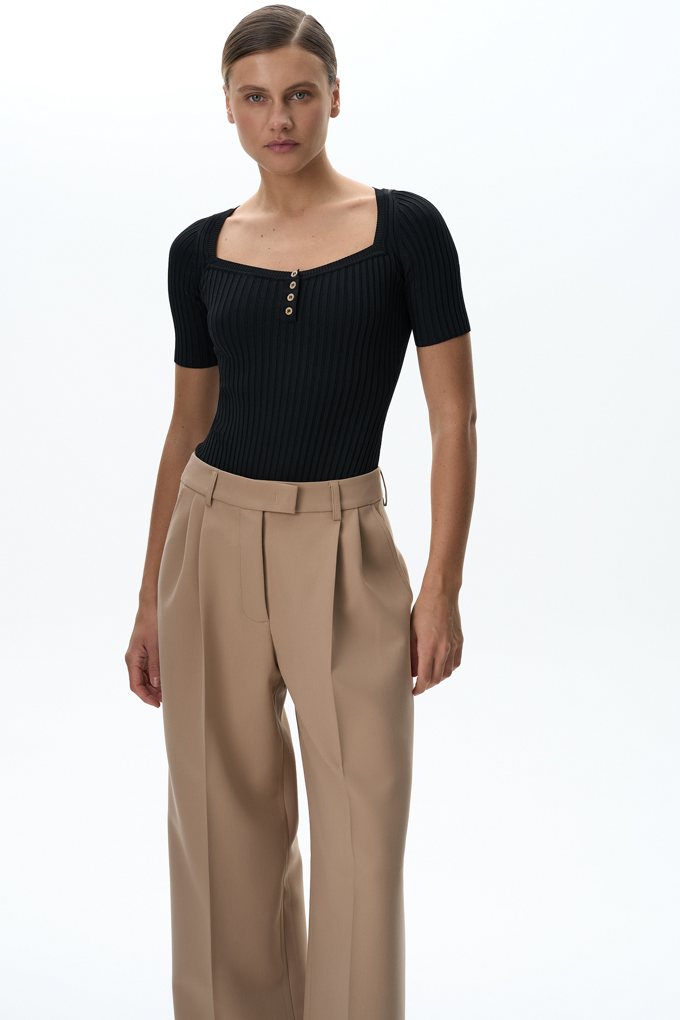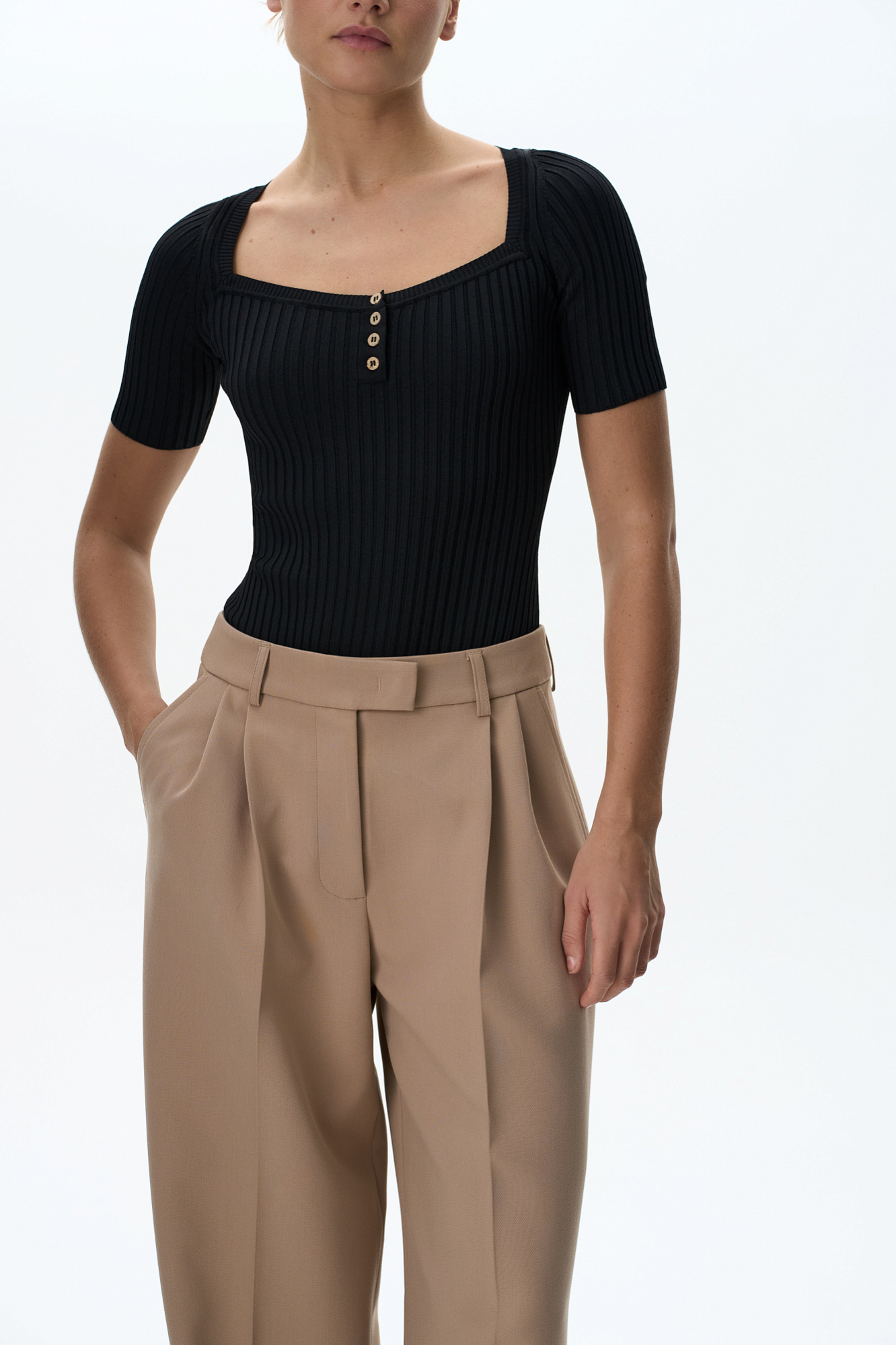 Трикотажное боди из вискозы в широкий рубчик. Модель с квадратным вырезом головины, коротким рукавом и застежкой на бельевые крючки. Изделие декорировано небольшими пуговицами.