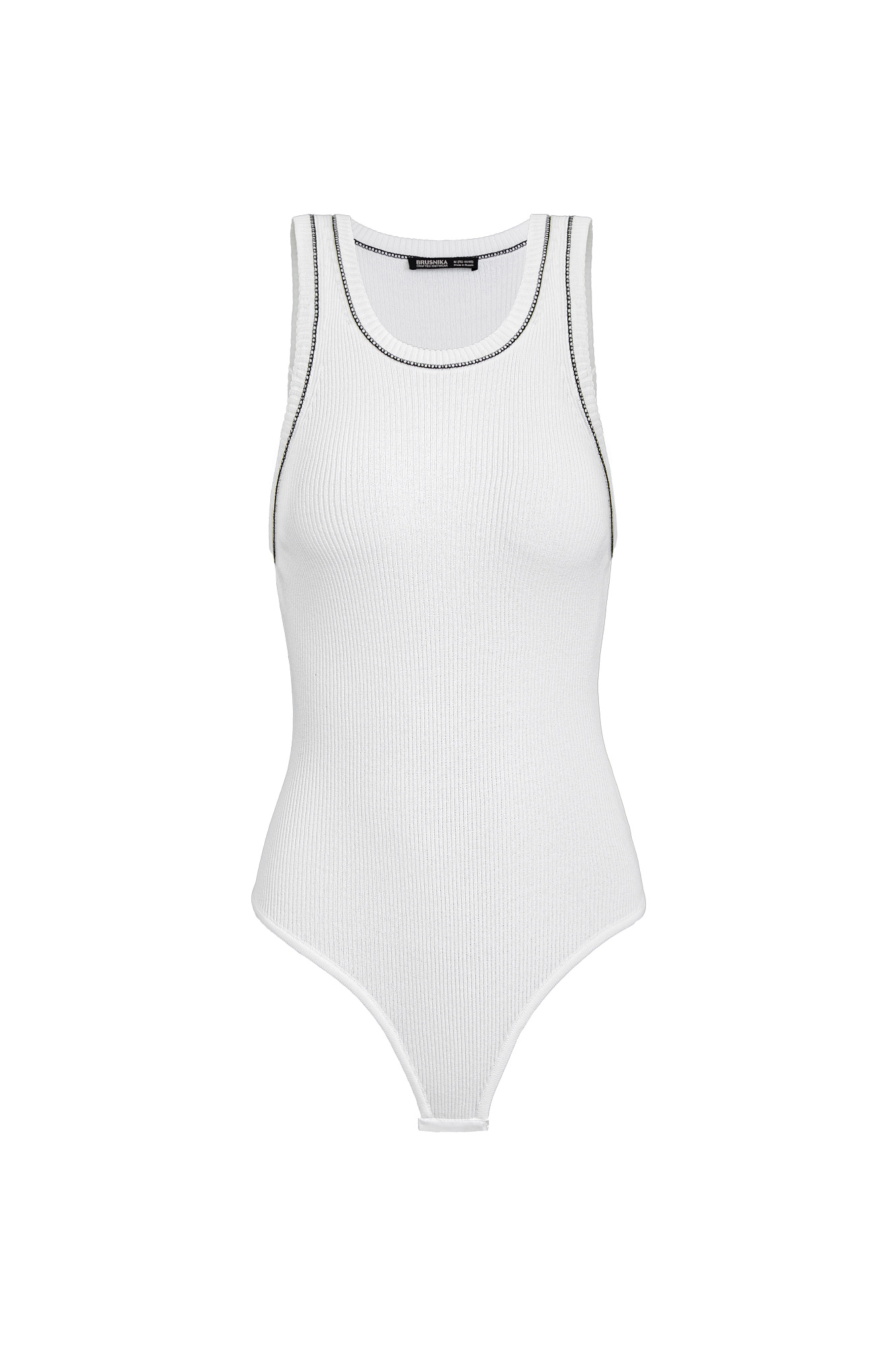 Трикотажное боди из вискозы в рубчик. Модель без рукавов с круглым вырезом горловины. Изделие декорировано контрастным кантом. Застежка на бельевые крючки.