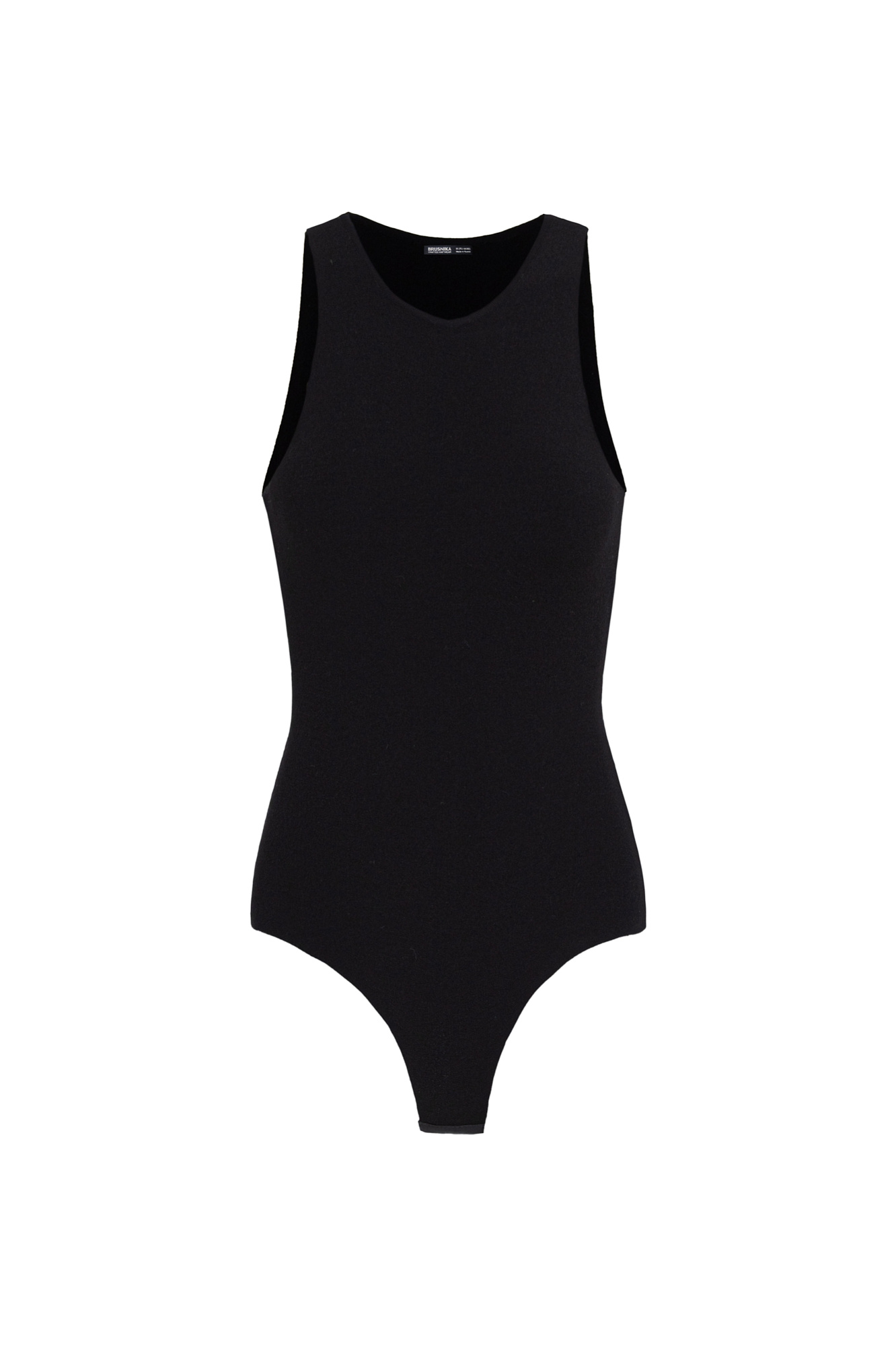 Трикотажное боди из вискозы. Модель приталенного силуэта без рукавов, с широкими лямками, круглым вырезом горловины и глубокой проймой. Застежка на бельевые крючки.