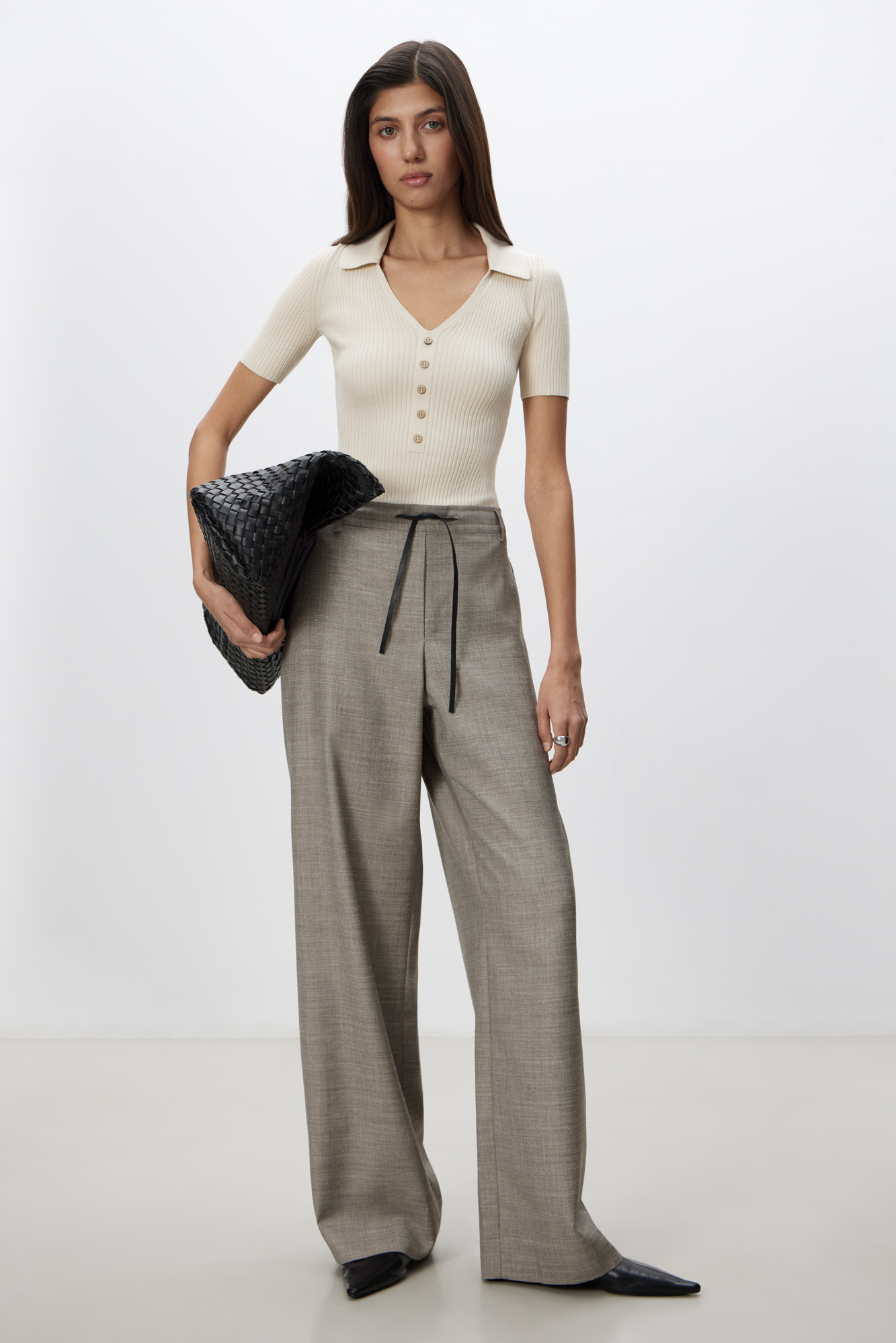 Трикотажное боди из вискозы в рубчик. Модель с коротким рукавом и V-образным вырезом горловины. Изделие декорировано маленькими пуговицами на планке. Застежка на бельевые крючки.