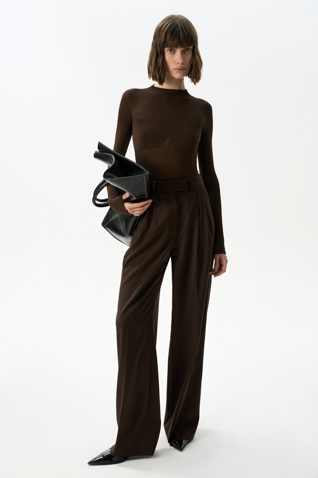 Трикотажное боди из вискозы. Модель с длинным рукавом и невысоким воротником, края изделия в рубчик. Застежка на бельевые крючки. Модель выполнена в комбинированной вязке: сетку и гладью в мелкий рубчик в области груди и низа изделия.