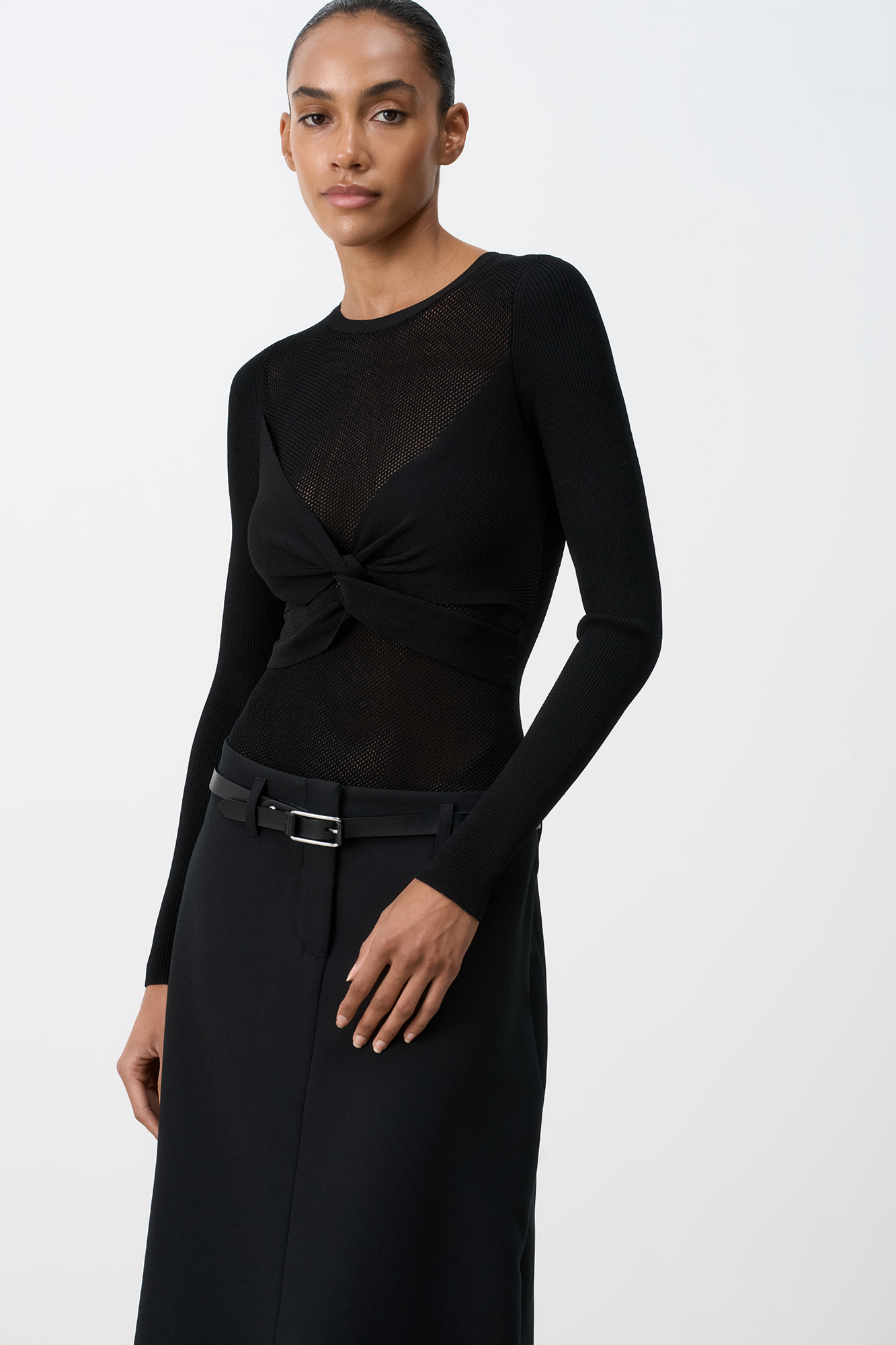 Трикотажное полупрозрачное боди из вискозы. Модель с длинными рукавами и круглым вырезом горловины. Изделие декорировано перекрутом на груди.