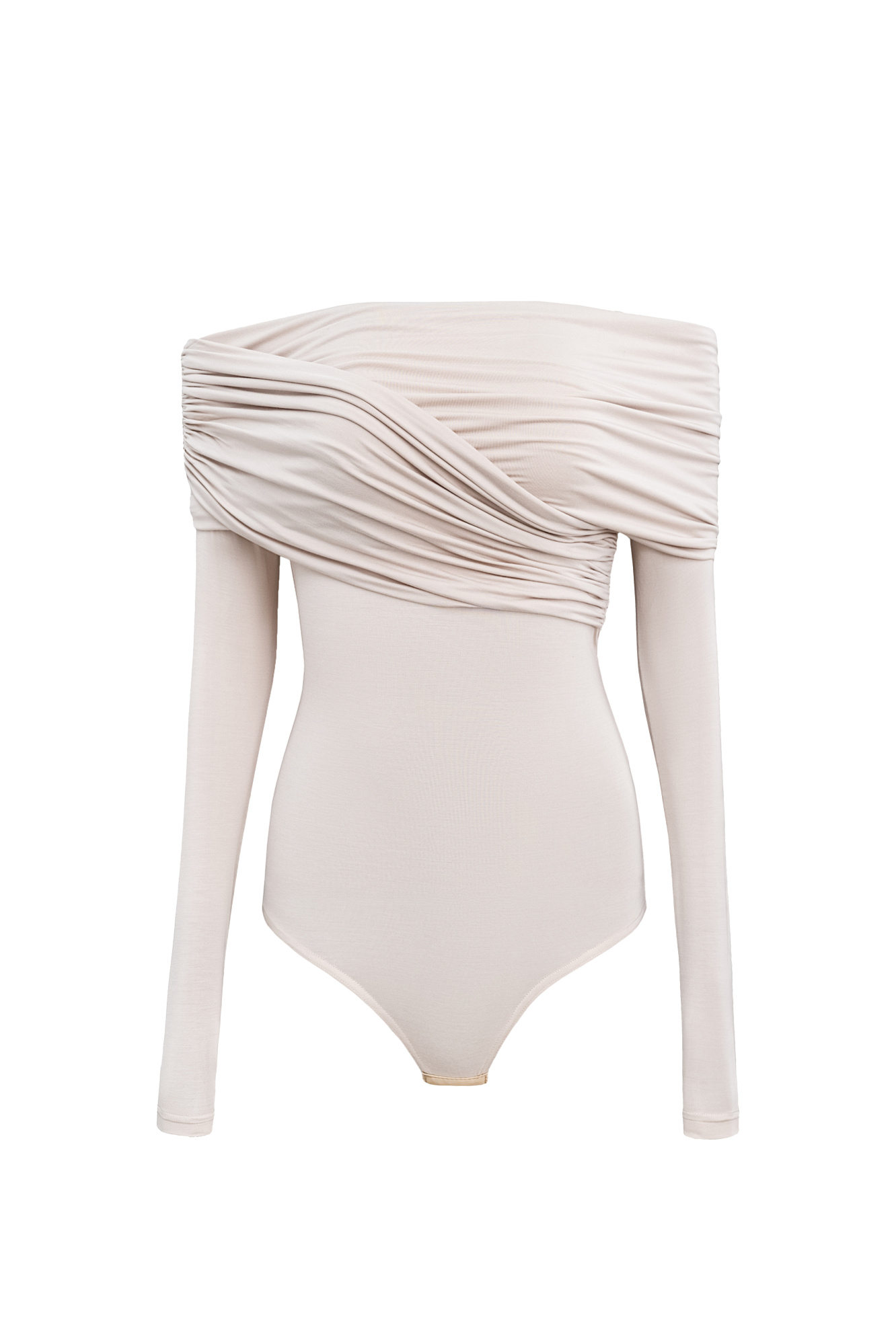 Боди из модала с драпировкой на груди. Модель приталенного силуэта, с длинным рукавом, открытой линией плеч и застежкой на бельевые крючки.