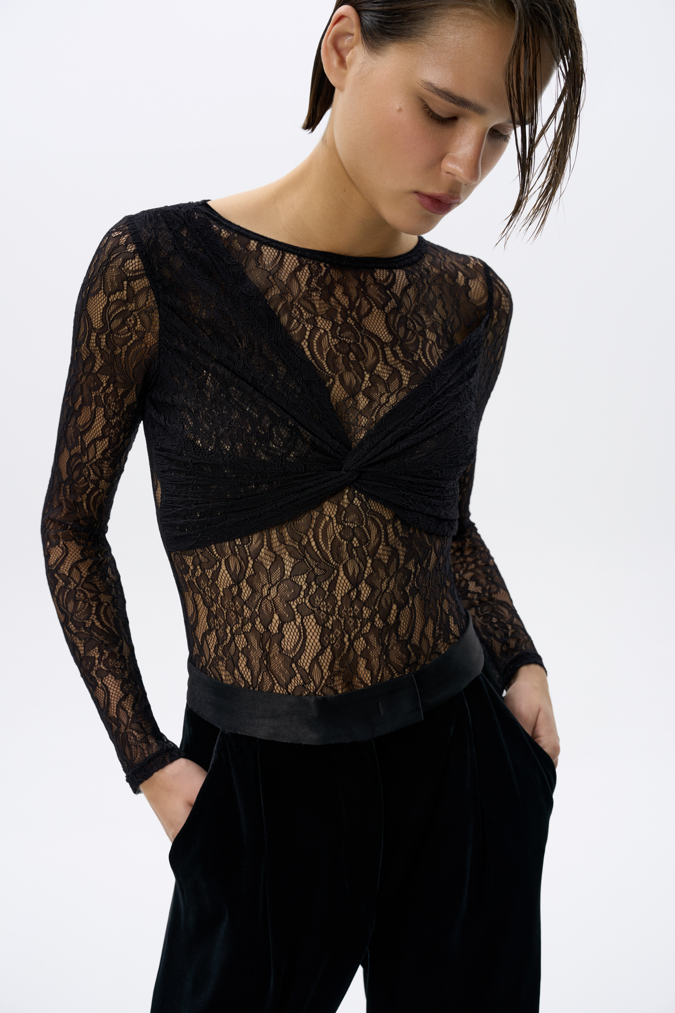 Кружевное боди с длинным рукавом и круглым вырезом горловины. Изделие декоривано драпировкой на лифе. Застежка на бельевые крючки. Изделие без подкладки.