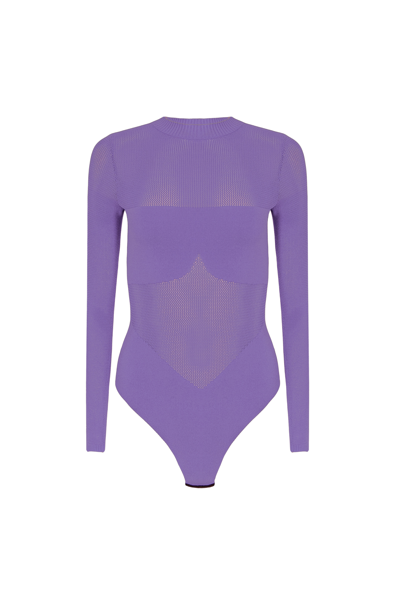 Трикотажное боди из вискозы. Модель с длинным рукавом и невысоким воротником, края изделия в рубчик. Застежка на бельевые крючки. Модель выполнена в комбинированной вязке: сетку и гладью в мелкий рубчик в области груди и низа изделия.
