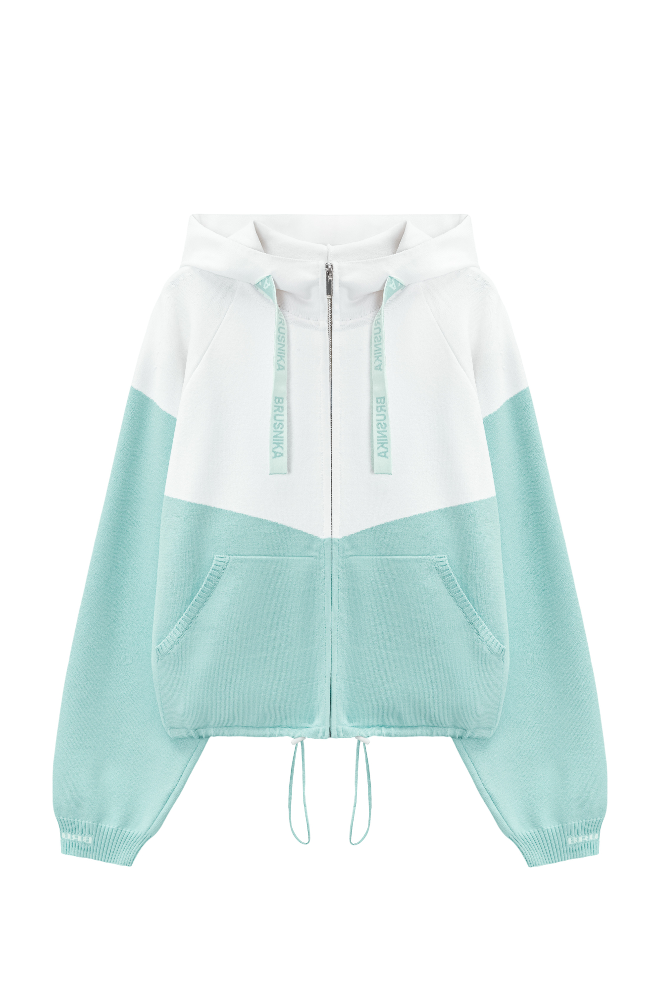 Трикотажный бомбер из вискозы с добавлением эластана. Модель выполнена в спортивном стиле, с капюшоном на шнурке и карманами. Низ изделия регулируется кулиской. Манжеты на резинке. Застежка на молнию.