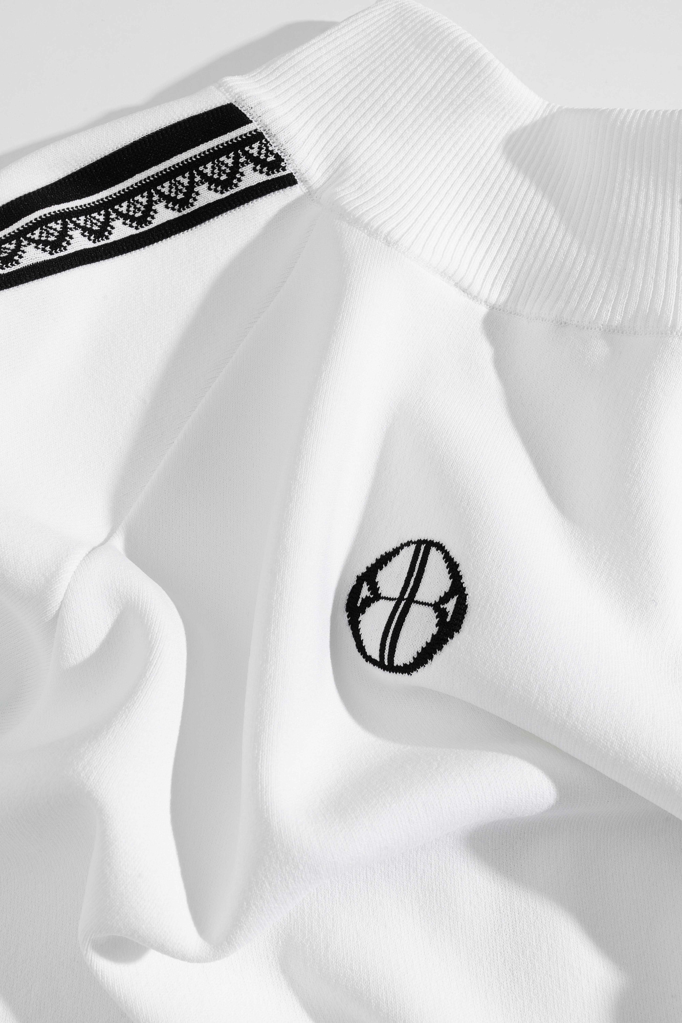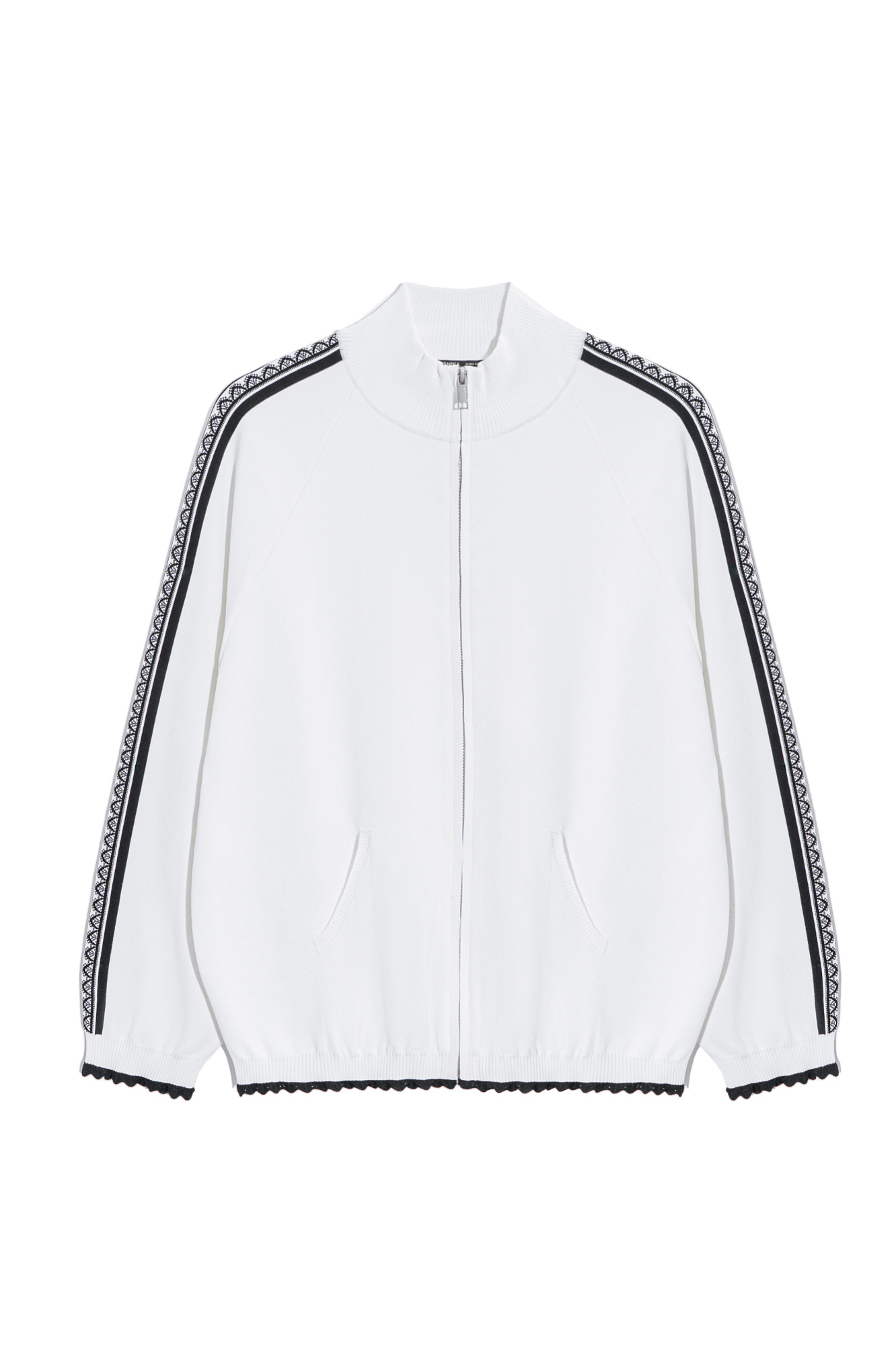 Трикотажный бомбер из вискозы. Модель свободного силуэта с невысоким воротником-стойкой, рукавом реглан, двумя карманами спереди и застежкой на молнию. Низ изделия и манжеты рукавов выполнены на резинке и дополнены кружевом. Изделие декорировано жаккардовым узором в виде кружева и логотипом бренда на спине.