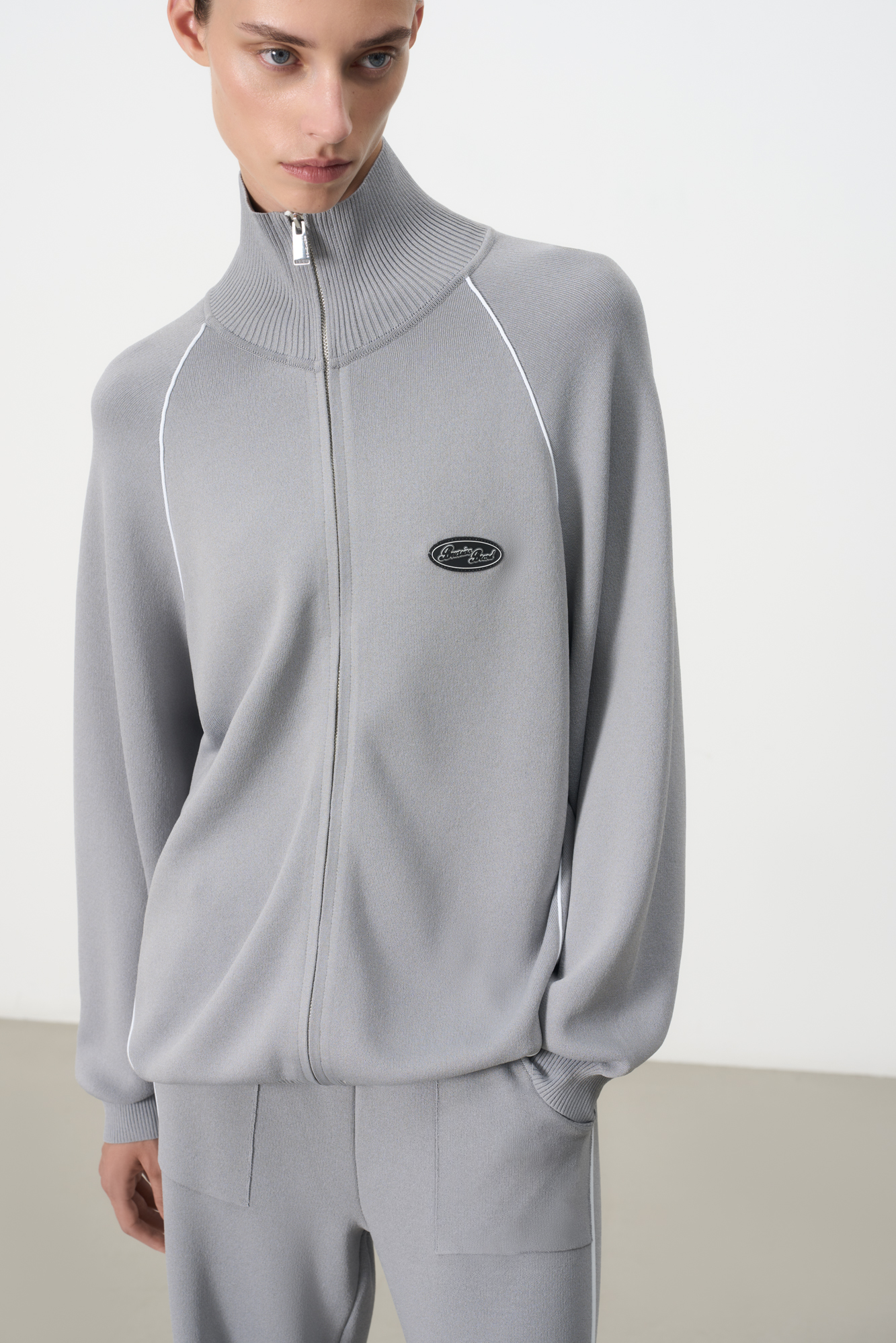 Бомбер в спортивном стиле из вискозы с лампасом. Модель с воротником-стойкой, манжетами на эластичной резинке и застежкой на молнию. Изделие декорировано лампасами контрастного цвета и брендированным ярлыком на груди.