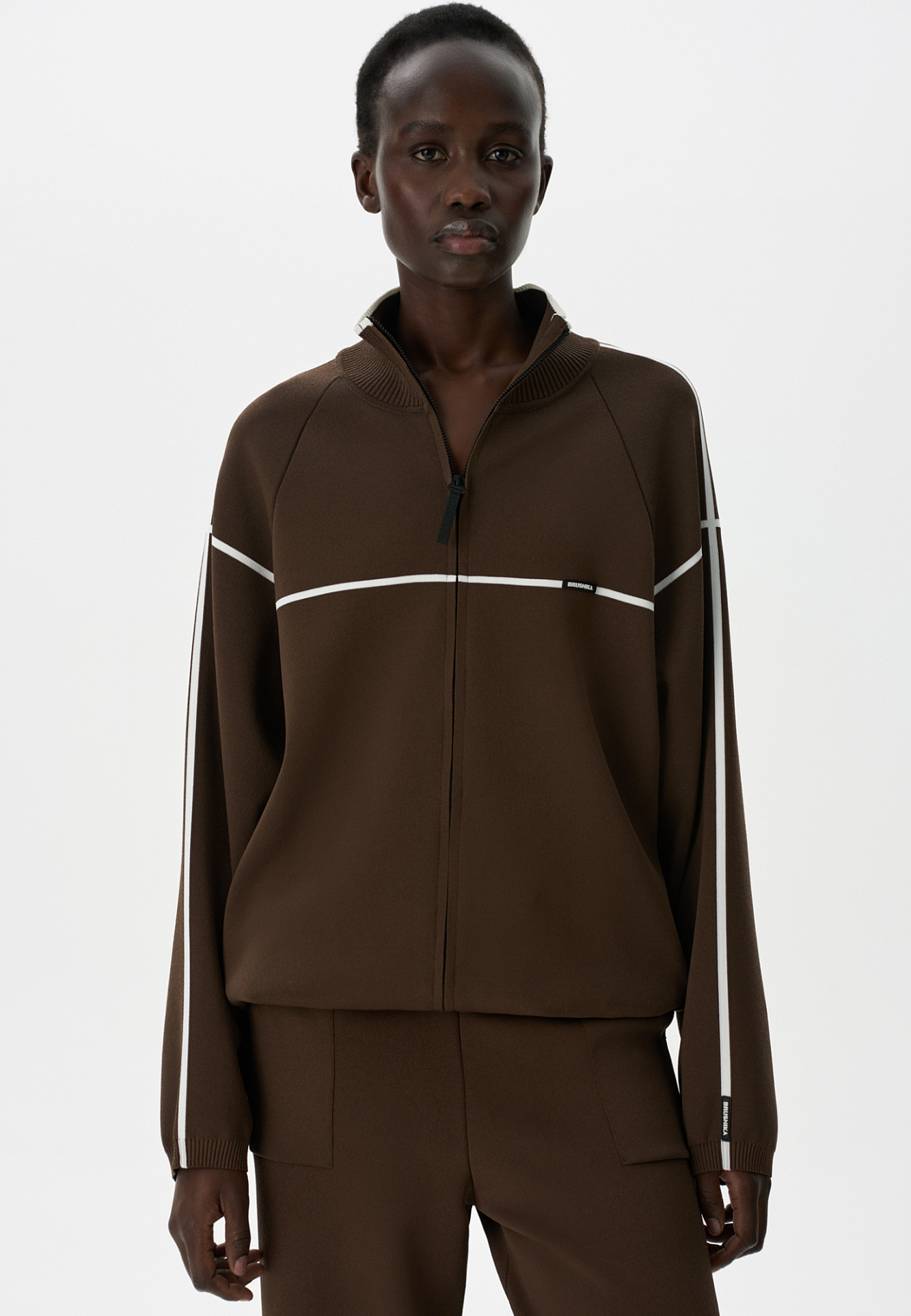 Вискозный трикотажный бомбер спортивного стиля с контрастными лампасами. Модель прямого кроя с длинными рукавами, манжетами на эластичной резинке и воротником-стойкой. По низу изделия предусмотрена регулируемая кулиска. Застежка на молнию.
