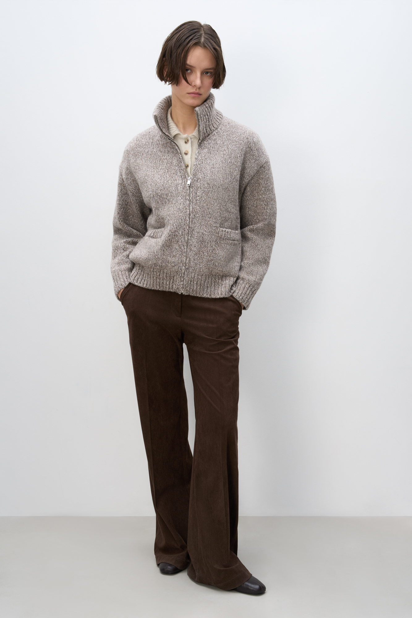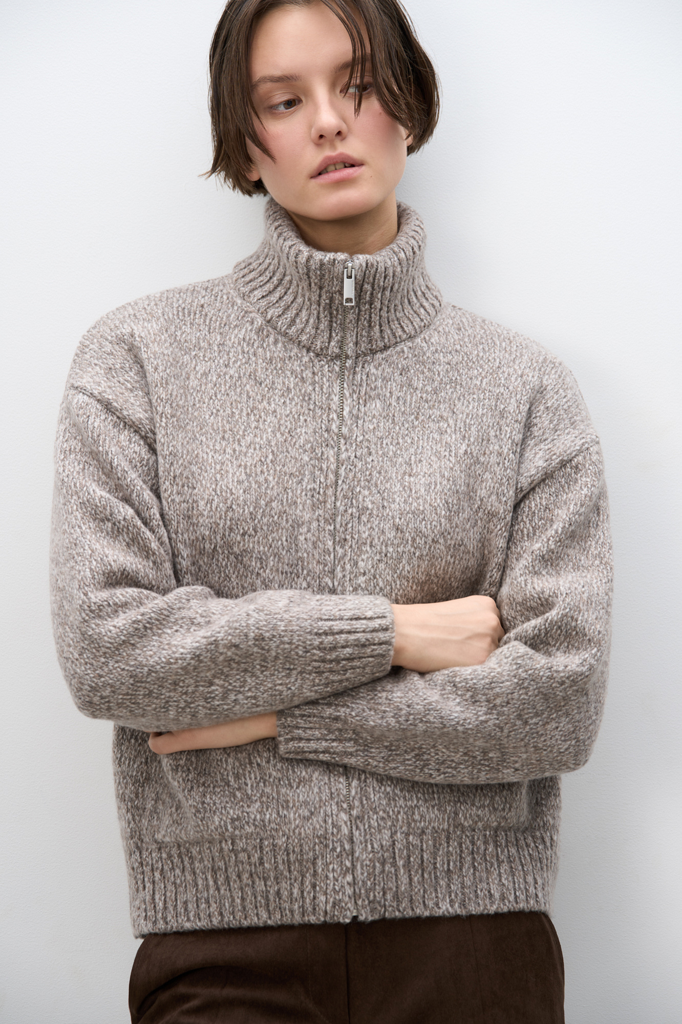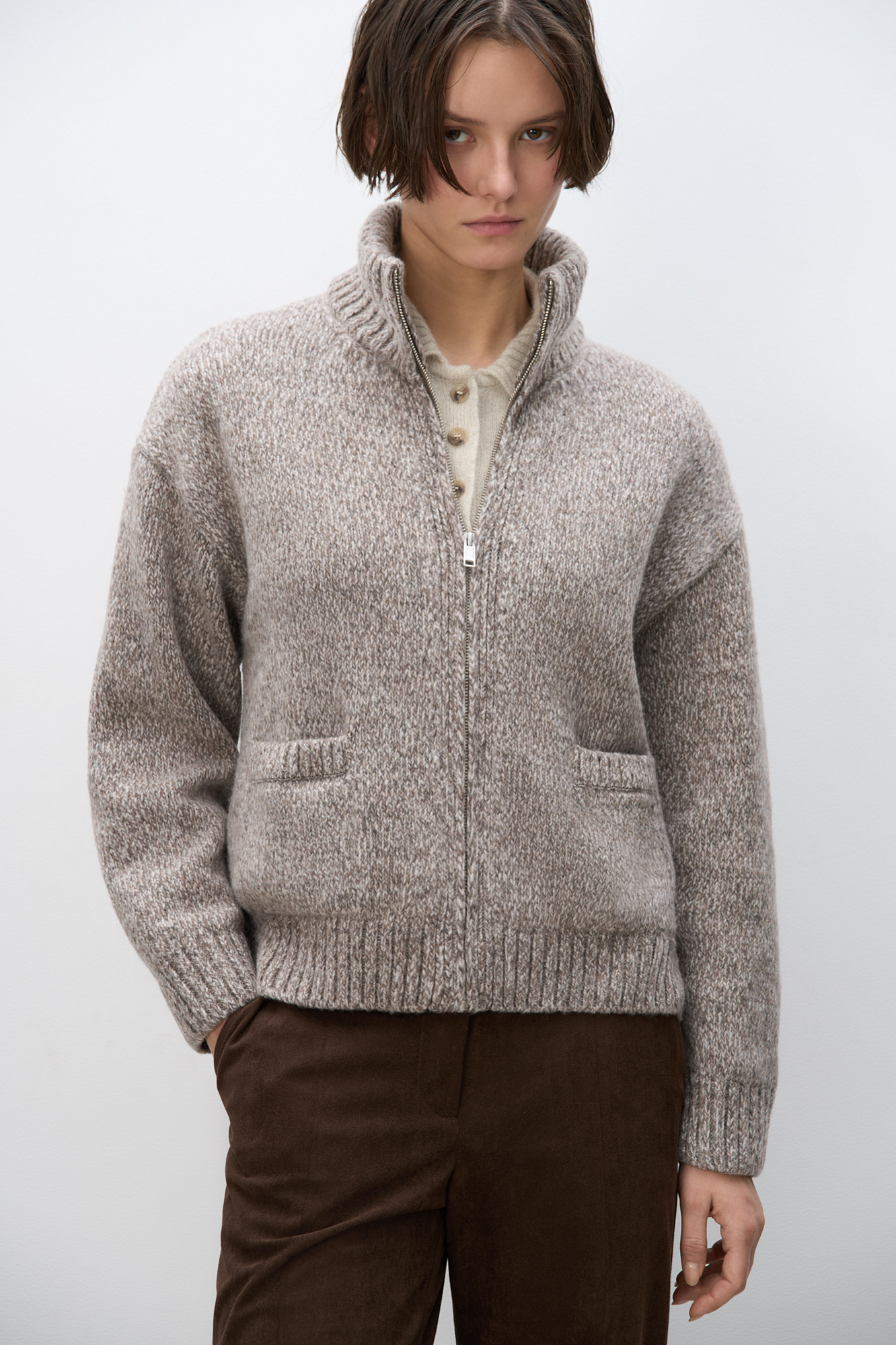 Трикотажный меланжевый бомбер из шерсти мериноса экстрафайн. Модель свободного силуэта со спущенной линией плеча, отложным воротником и двумя накладными карманами. Манжеты рукавов, низ и воротник изделия выполнены в рубчик.