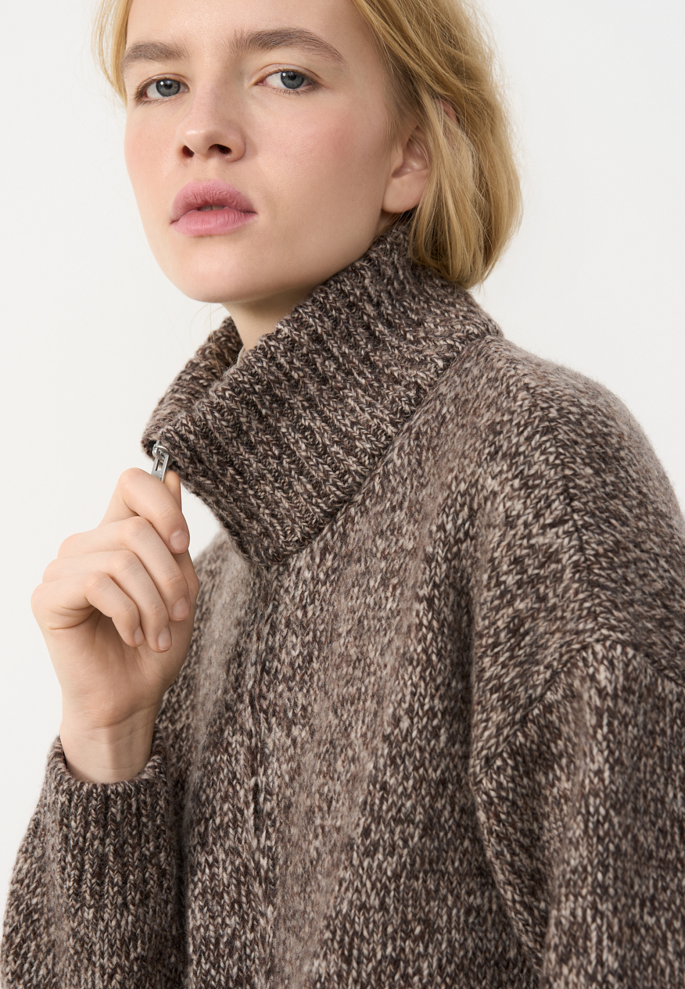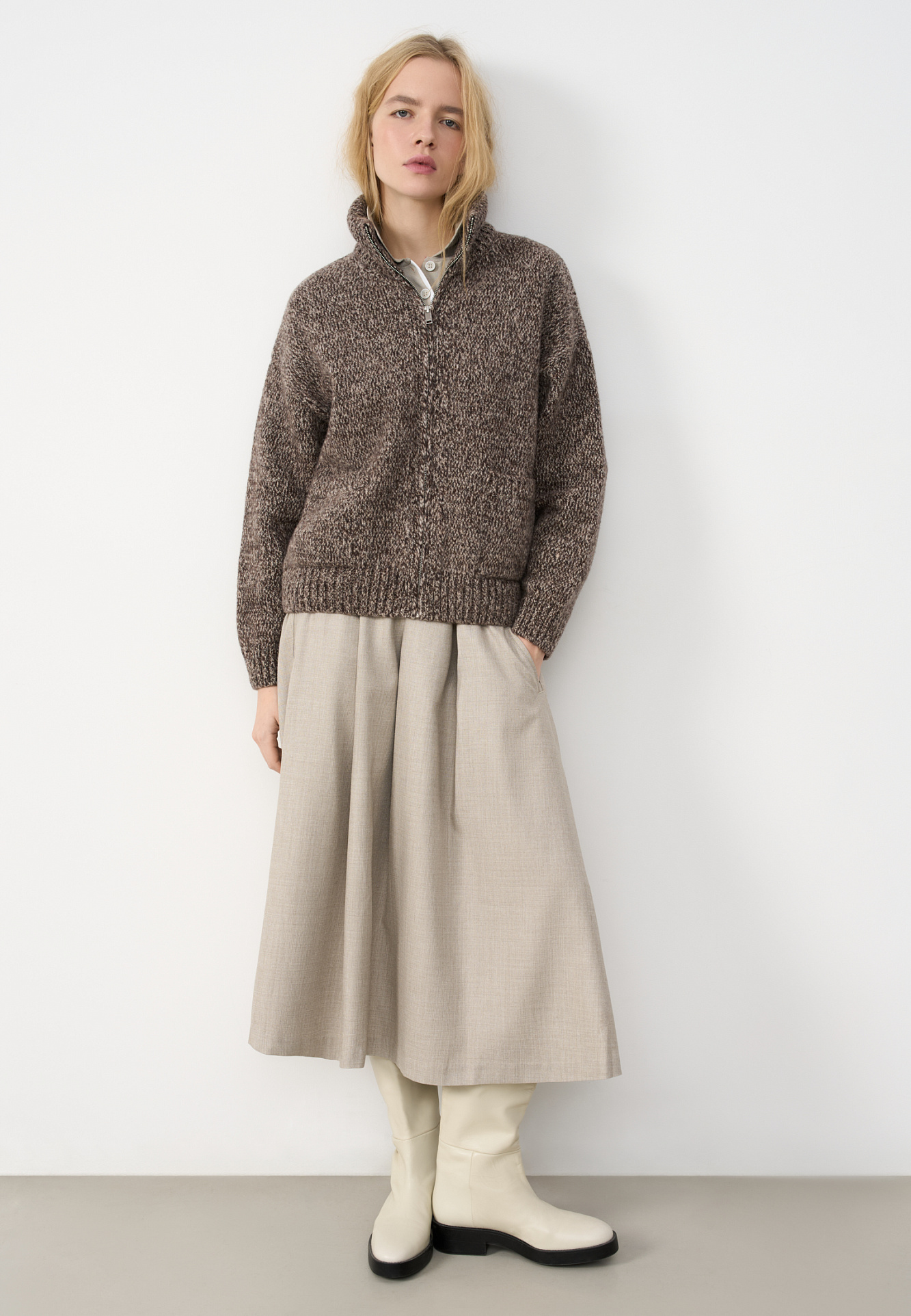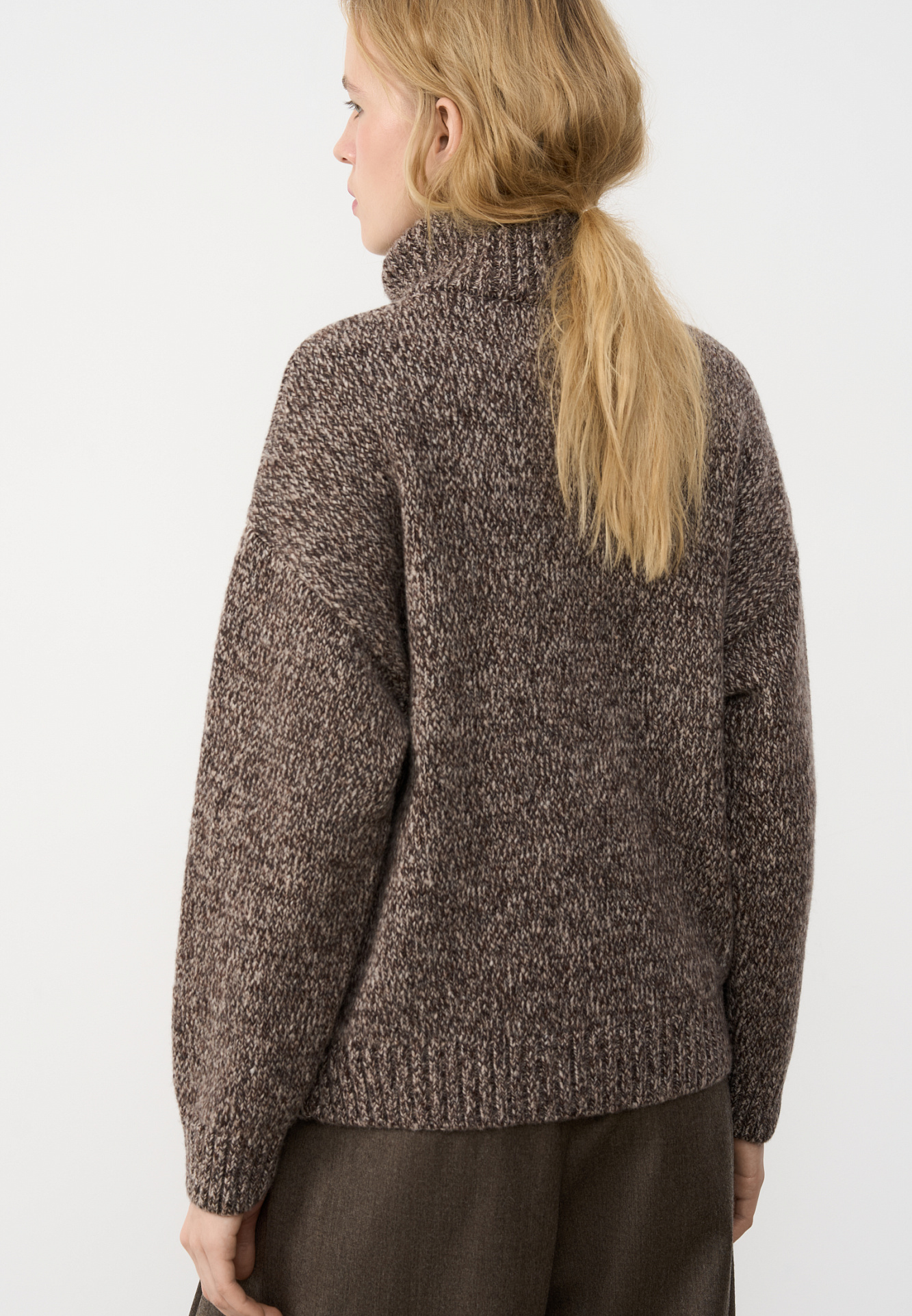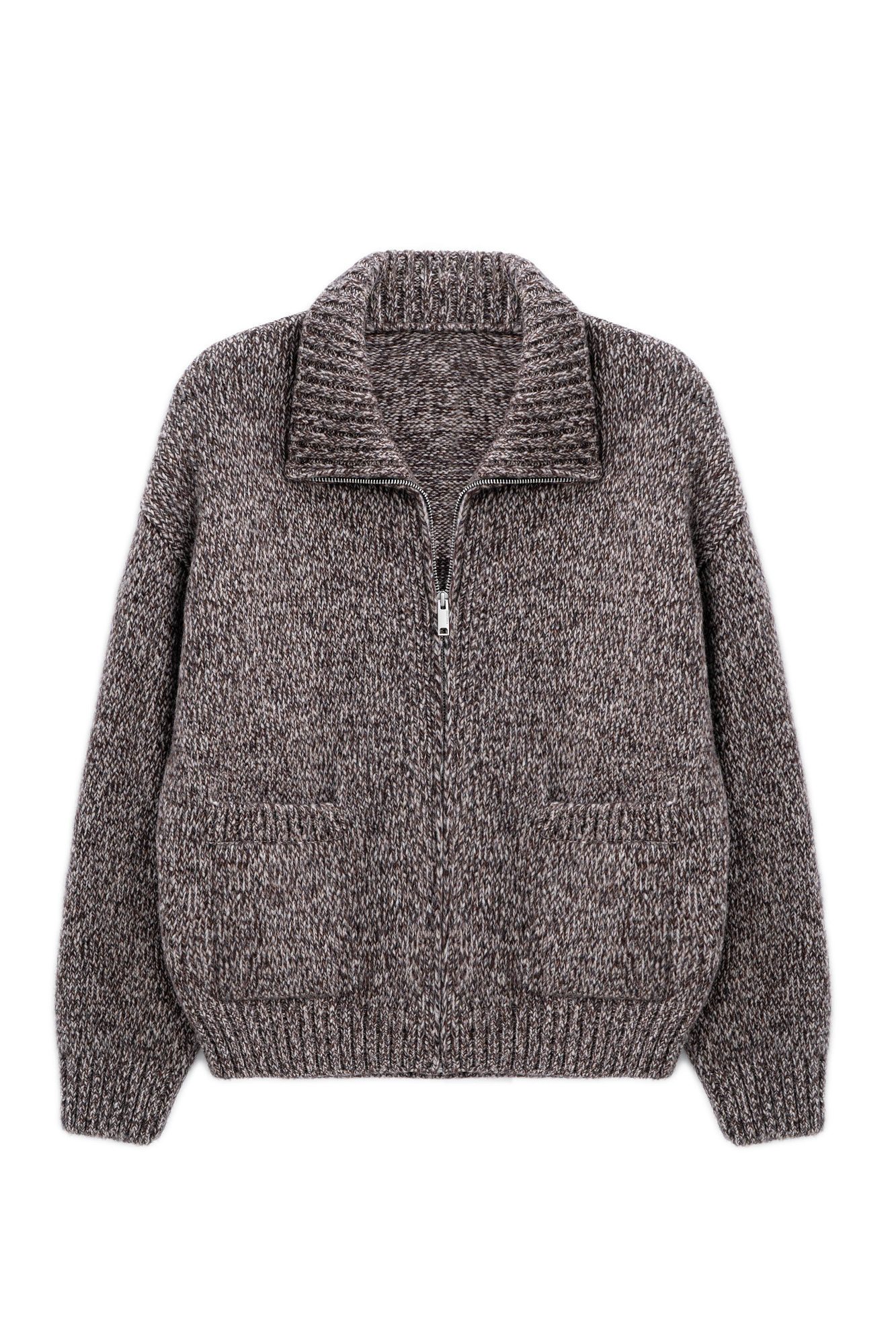 Трикотажный меланжевый бомбер из шерсти мериноса экстрафайн. Модель свободного силуэта со спущенной линией плеча, отложным воротником и двумя накладными карманами. Манжеты рукавов, низ и воротник изделия выполнены в рубчик.
