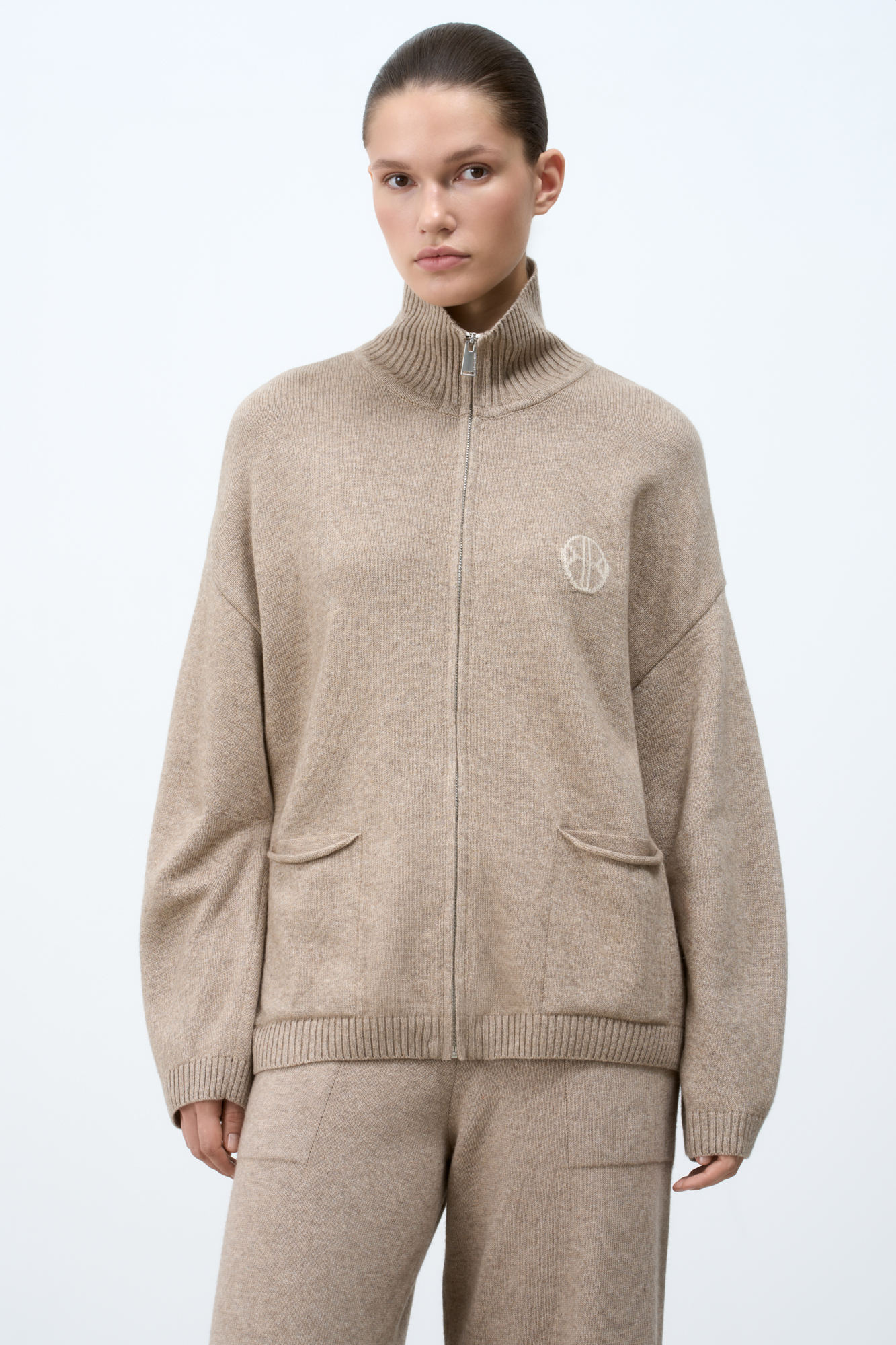 Трикотажный бомбер в спортивном стиле. Модель свободного силуэта со спущенной линией плеча и боковыми карманами. Вышивка логотипа бренда на груди. Застежка на молнию.