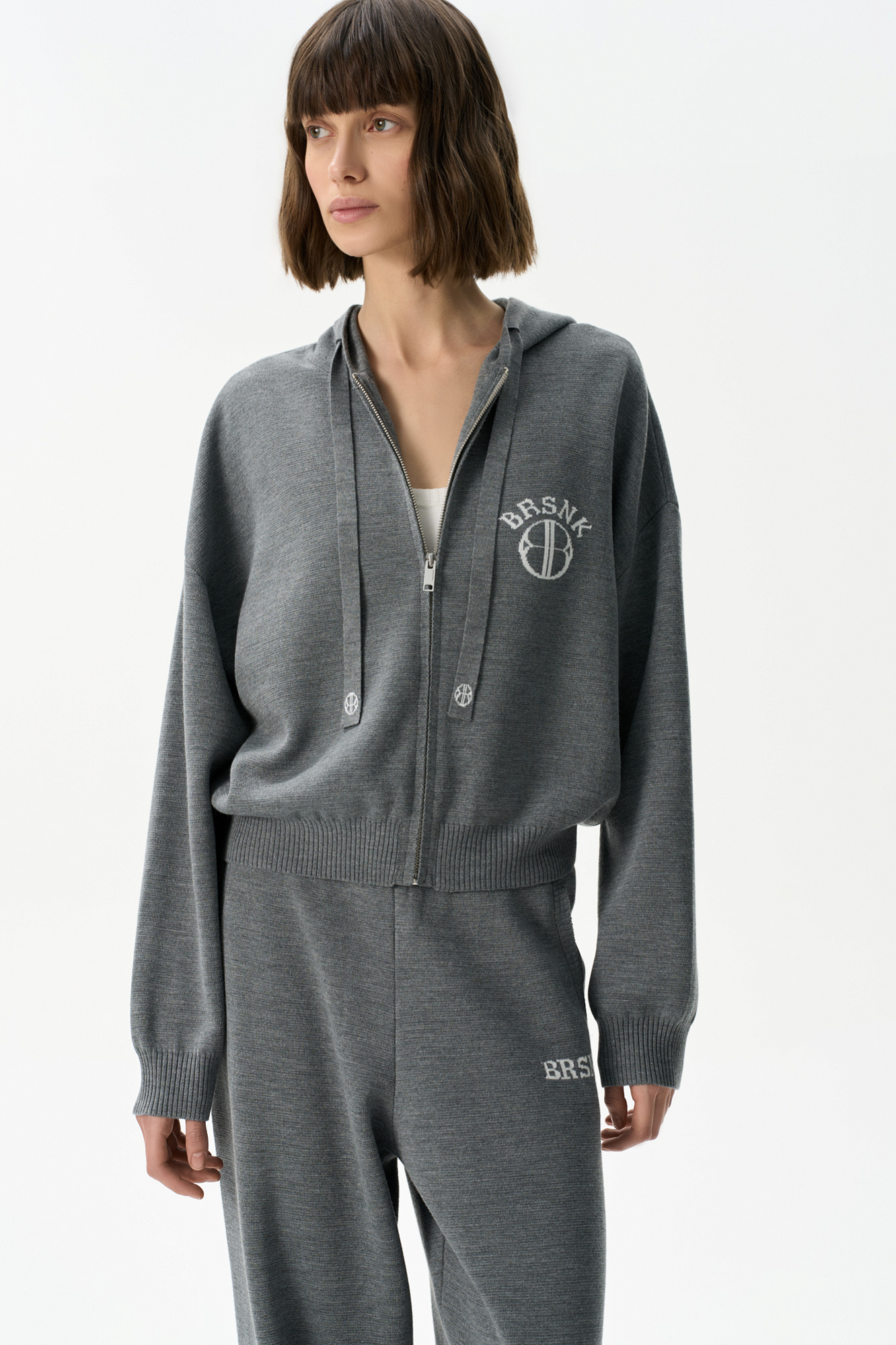 Трикотажный бомбер в спортивном стиле из шерсти с добавлением акрила. Модель свободного силуэта со спущенной линией плеча и капюшоном на кулиске. Низ изделия и манжеты рукавов выполнены на эластичной резинке. Изделие декорировано брендированным жаккардом на груди и шнурке. Застежка на молнию.