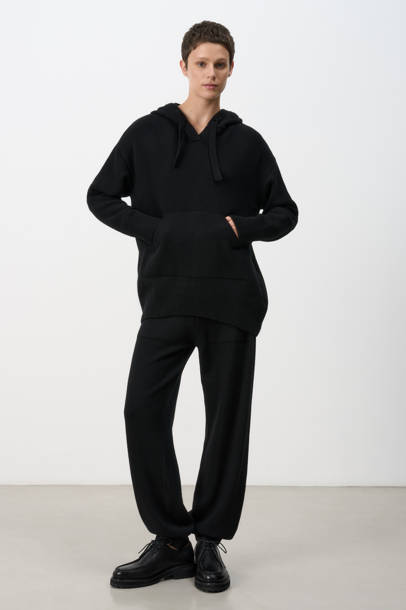 Трикотажное худи из кашемира и шерсти. Модель свободного силуэта, со спущенной линией плеч, глубоким капюшоном на кулиске и карманом-кенгуру. Края изделия выполнены в рубчик.