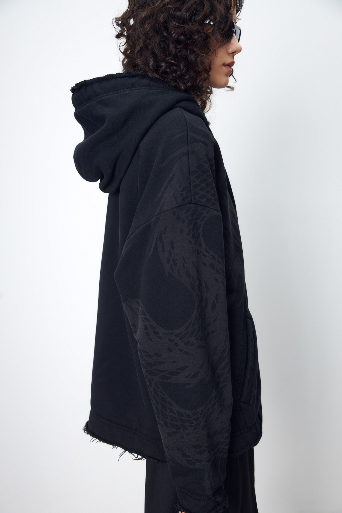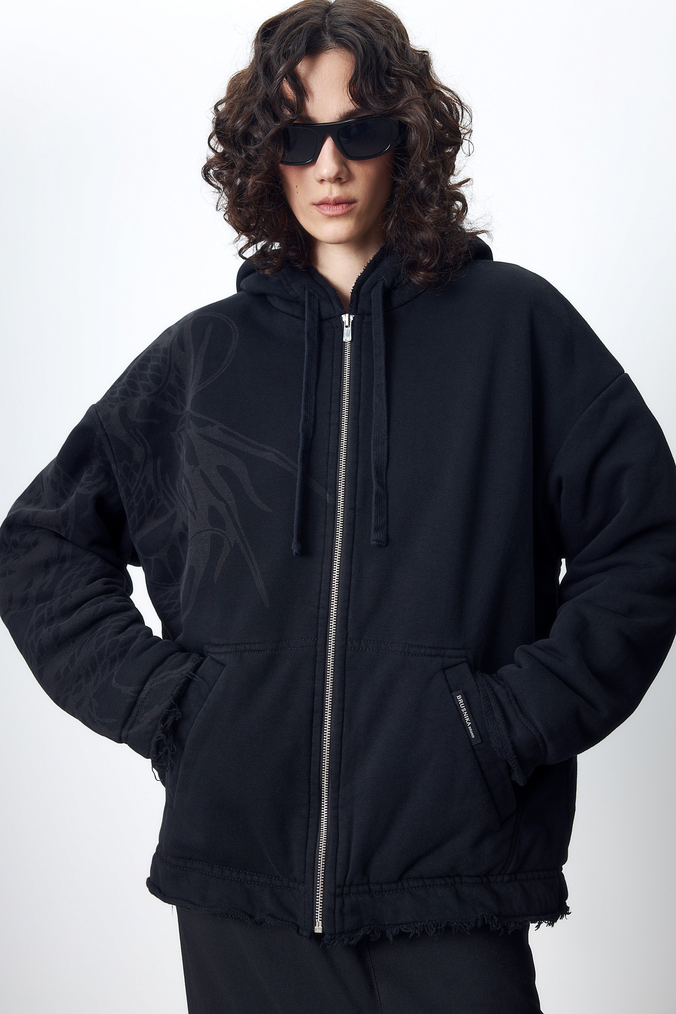 Бомбер с принтом на плече. Модель свободного силуэта со спущенной линией плеча и необработанными краями. Боковые карманы, капюшон на кулиске и застежка на молнию.