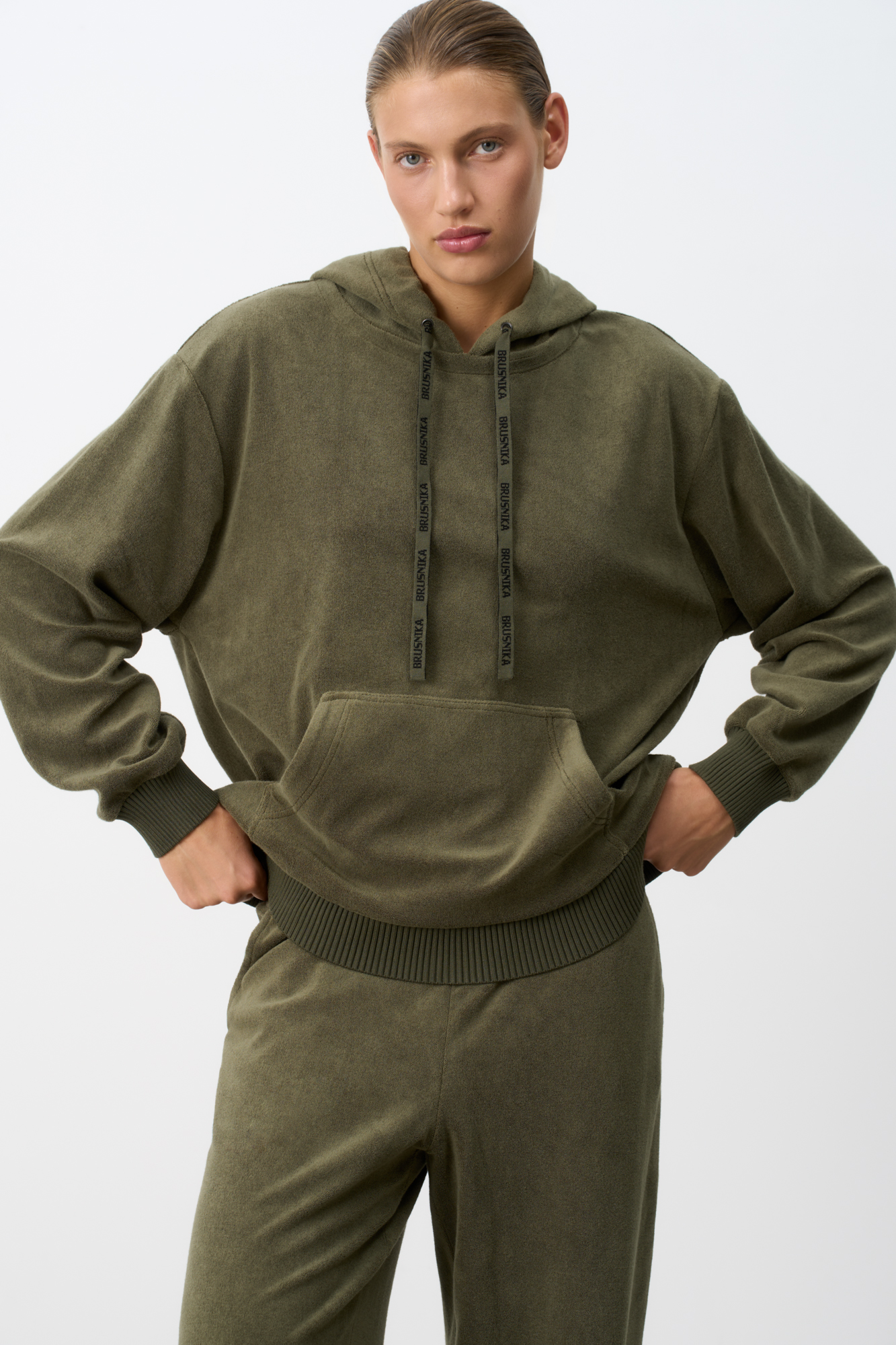 Худи из махрового трикотажа. Модель свободного силуэта со спущенной линией плеча. Капюшон с брендированным вязанным шнурком и накладной карман-кенгуру. Манжет и низ изделия обработан рибом. Дополнить образ можно брюками в таком же стиле.