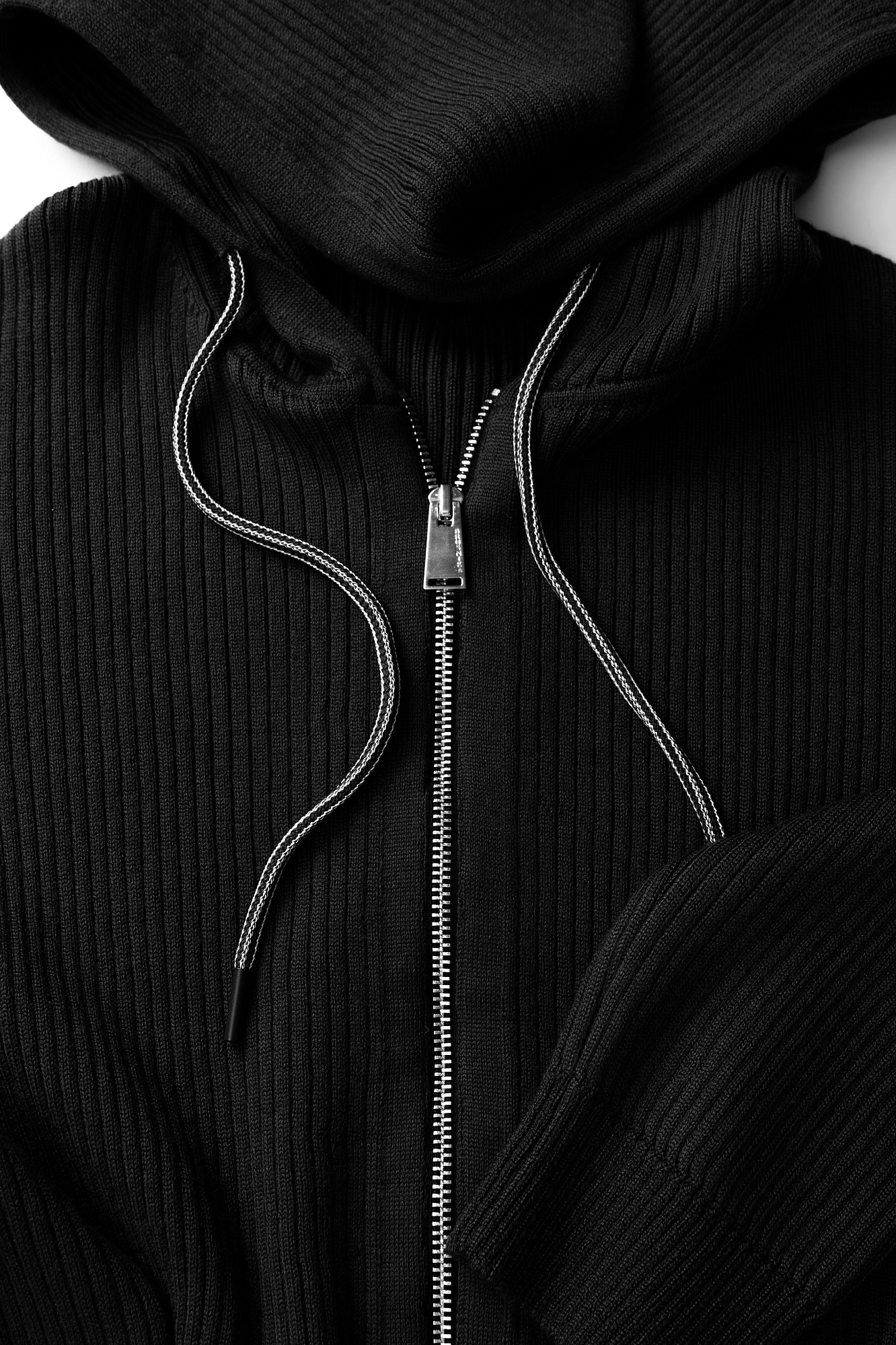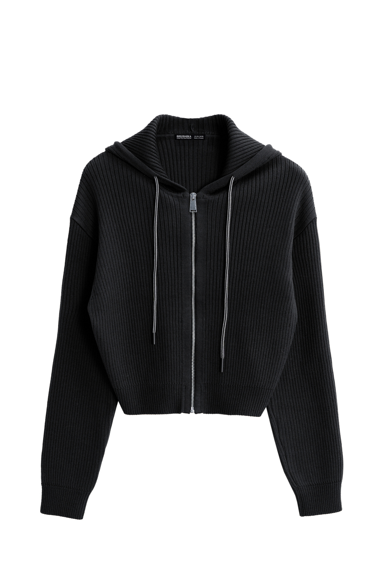 Короткий трикотажный бомбер из шерсти. Модель свободного силуэта, со спущенной линией пллеч, длинными рукавами и капюшоном с кулиской. Низ изделия и манжеты рукавов выполнены на эластичной резинке. Застежка на молнию.