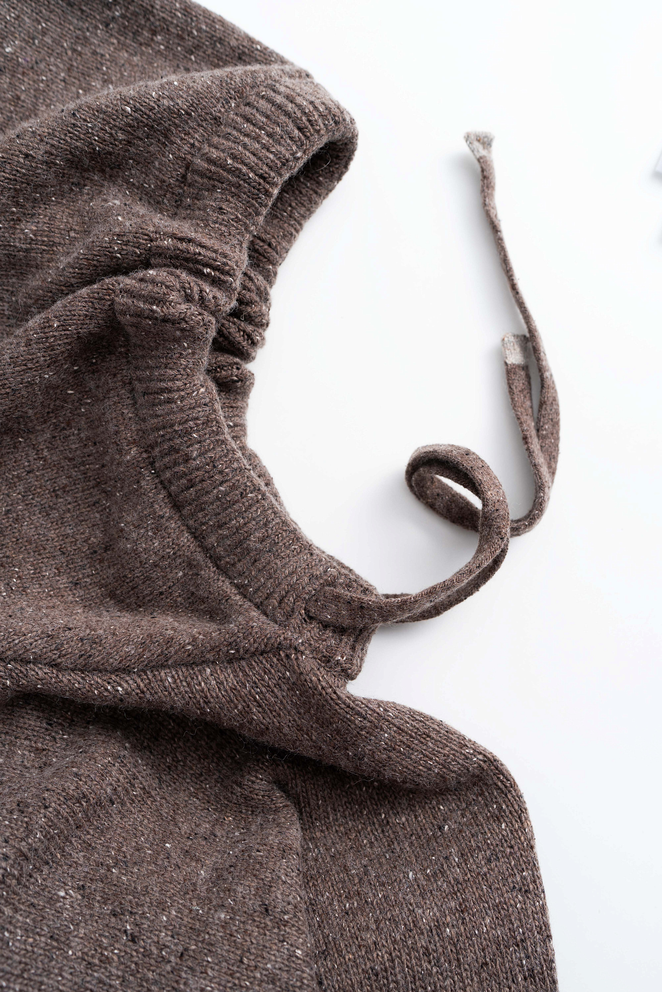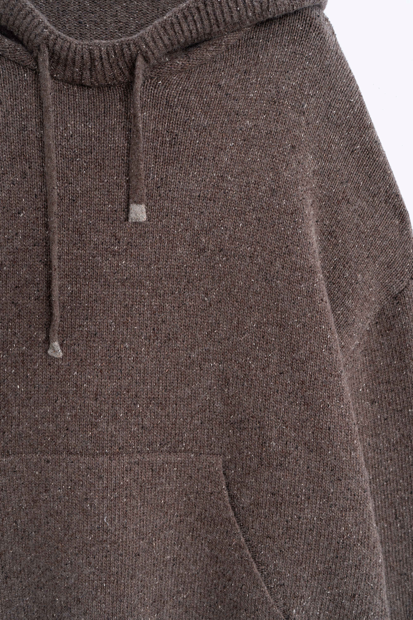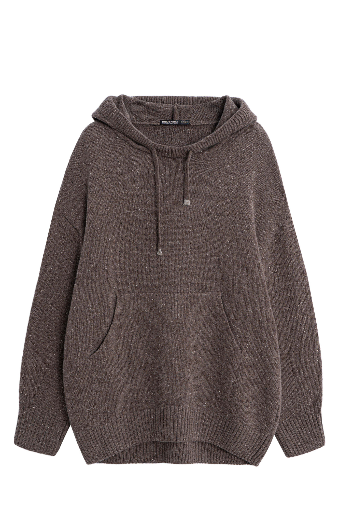 Трикотажное худи с капюшоном с добавлением шелка. Модель свободного силуэта, со спущенной линией плеч, длинными рукавами, широким капюшоном на кулиске и карманом-кенгуру. Края изделия выполнены в широкий рубчик.