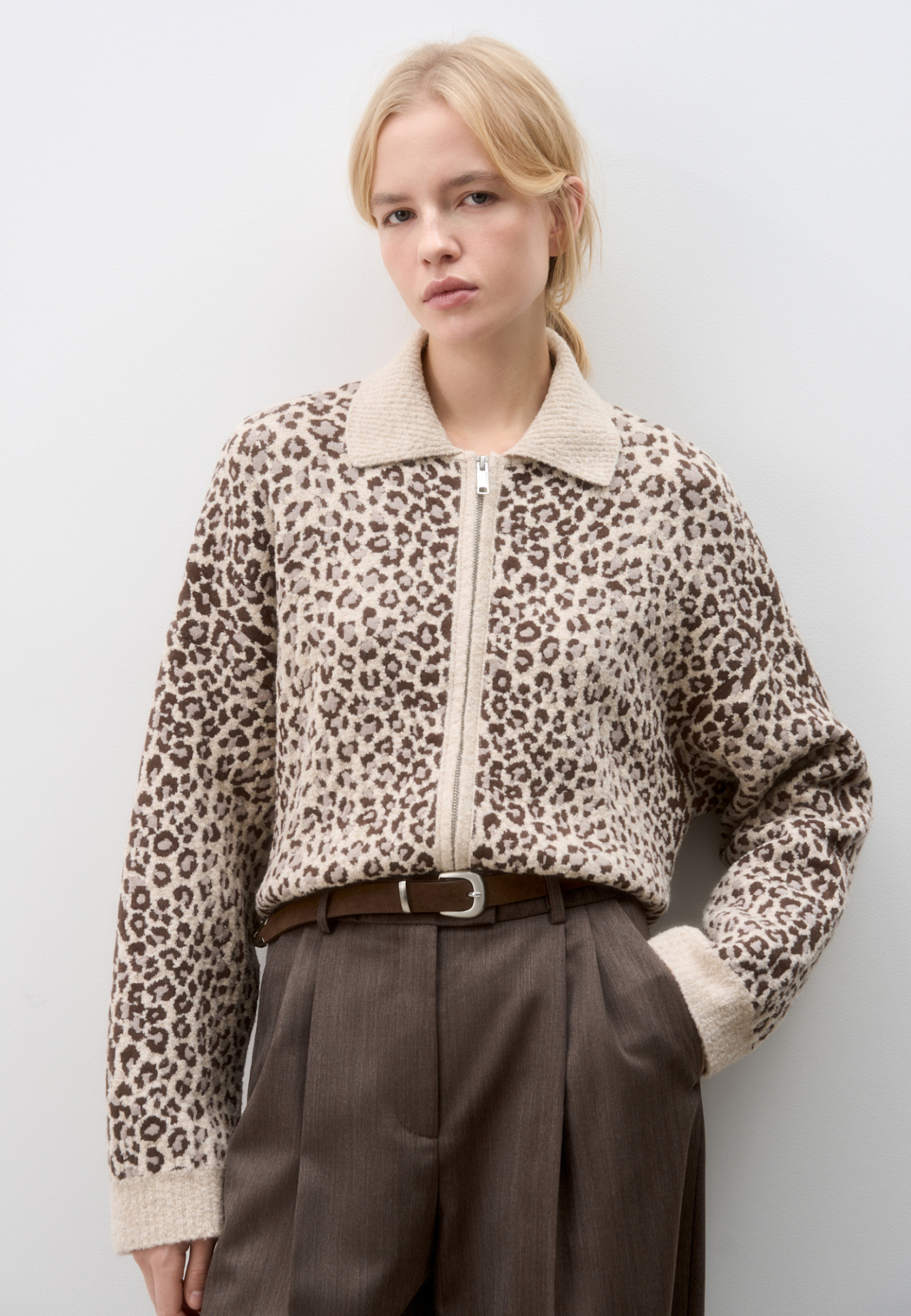Бомбер с жаккардовым анималистическим дизайном. Модель свободного силуэта с застежкой на молнию. Дополнить образ можно юбкой в таком же стиле.