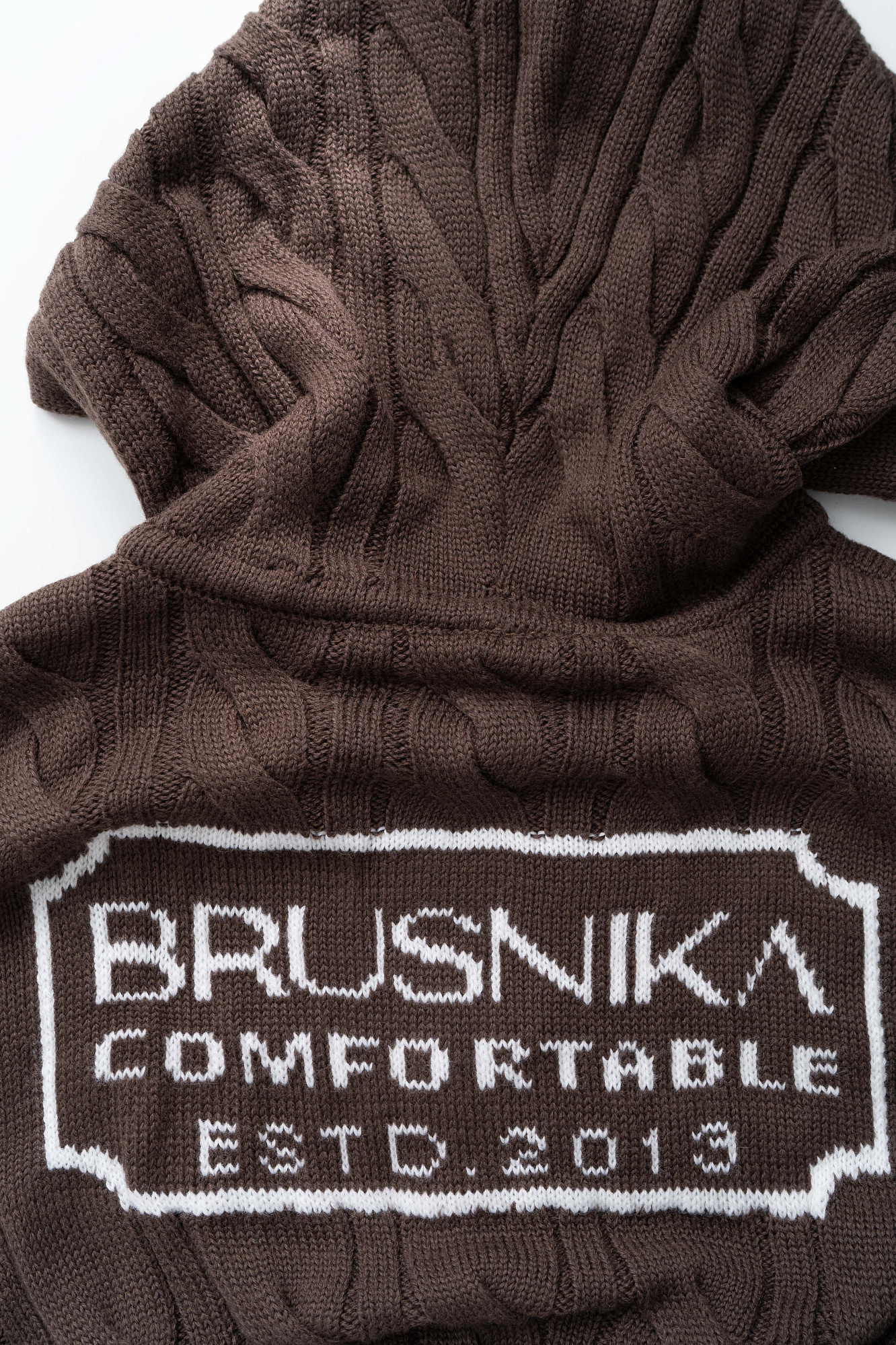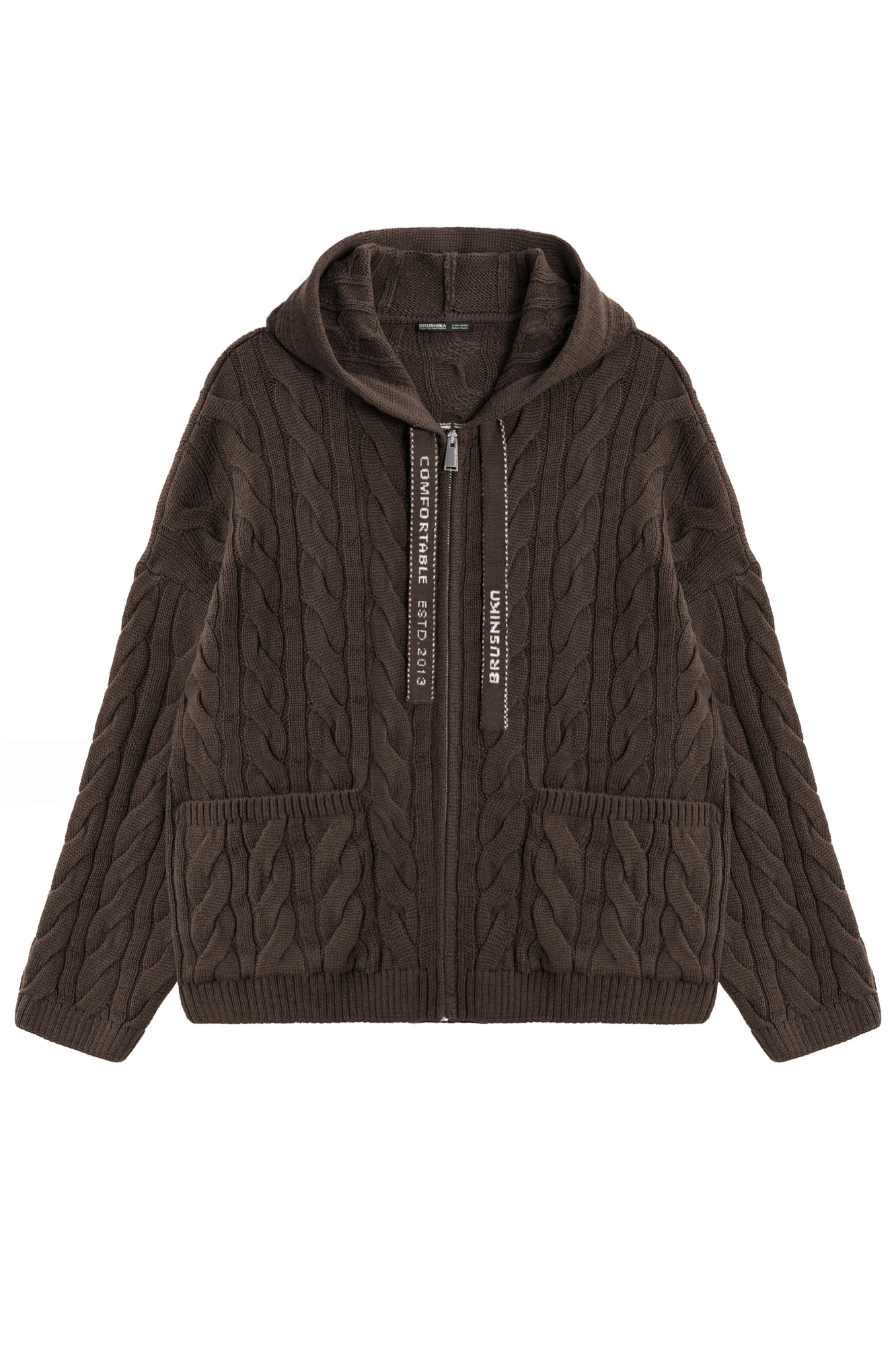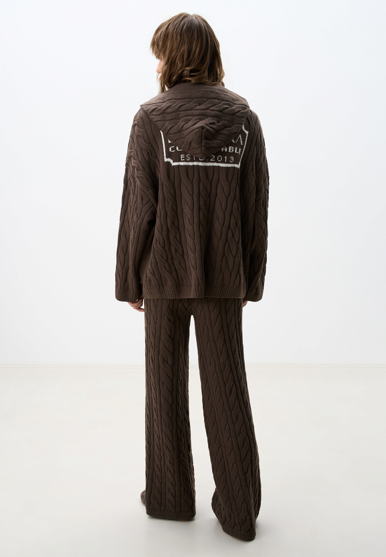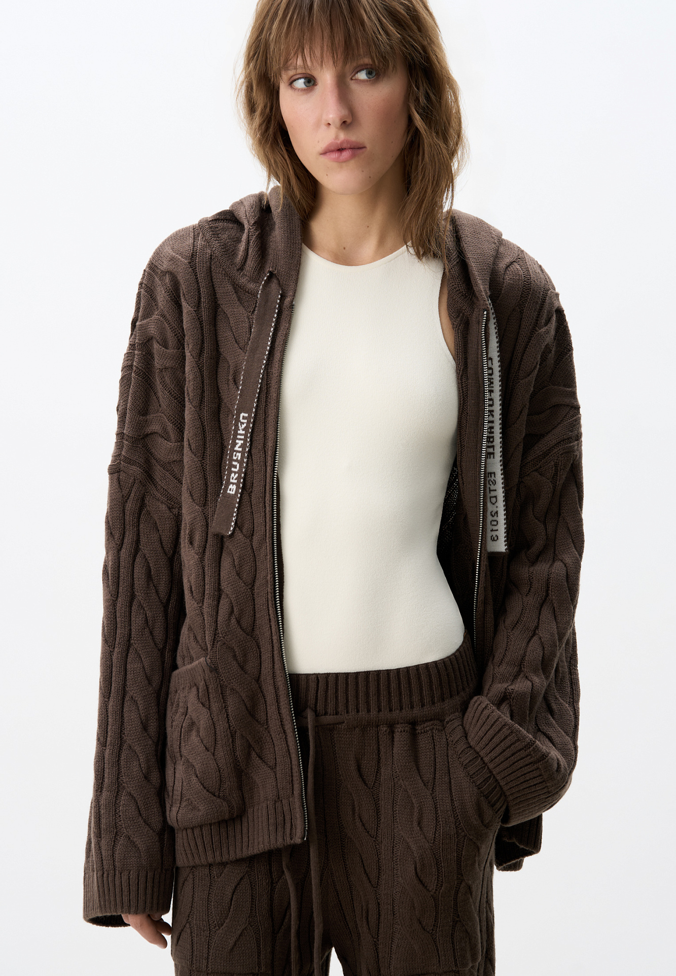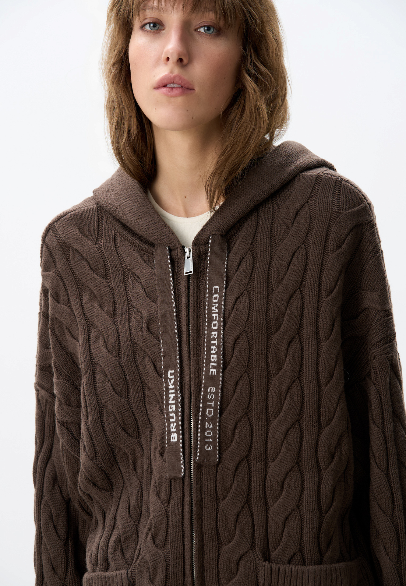 Трикотажное худи с объемными косами из мягкой шерсти. Модель свободного силуэта, со спущенной линией плеч, накладными карманами и капюшоном. Изделие декорировано брендированным жаккардом на спине. Застежка на молнию. Выполнено без подкладки. Дополнить образ можно брюками или юбкой в том же стиле.