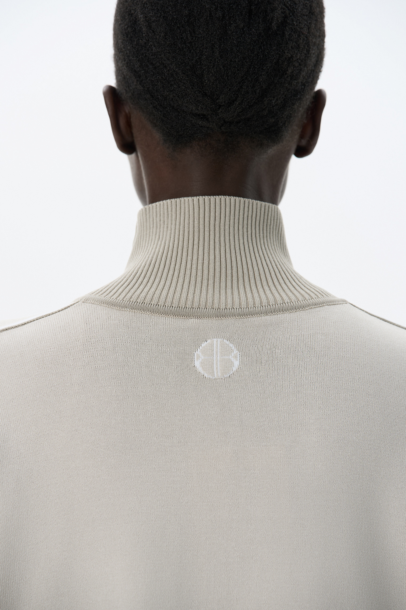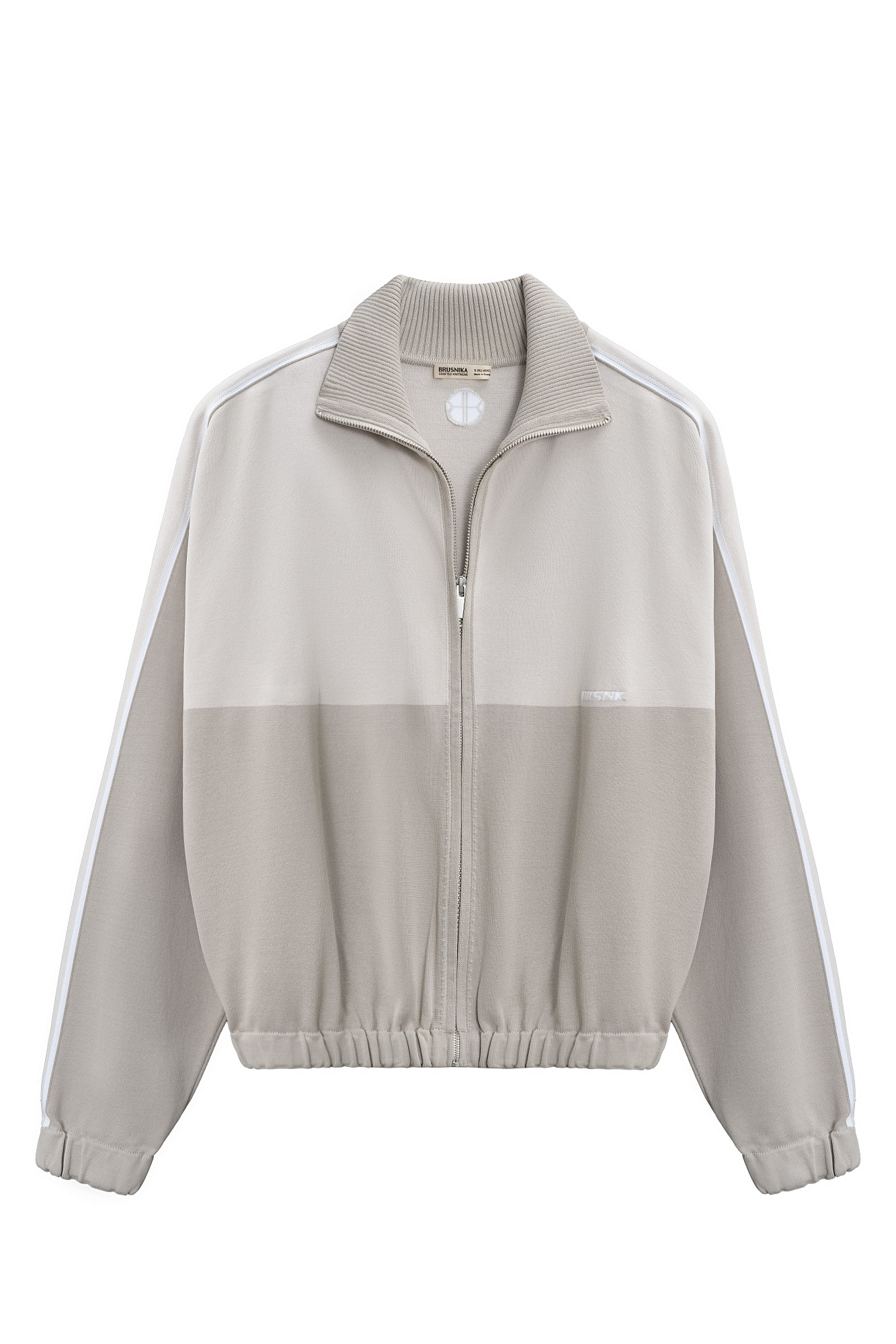 Трикотажный спортивный бомбер из вискозы. Модель прямого силуэта, со спущенной линией плеч, длинными рукавами с широкими лампасами и невысоким воротником-стойкой. Низ изделия и манжеты рукавов выполнены на резинке. Застежка на молнию. Брендированный жаккард на спине.