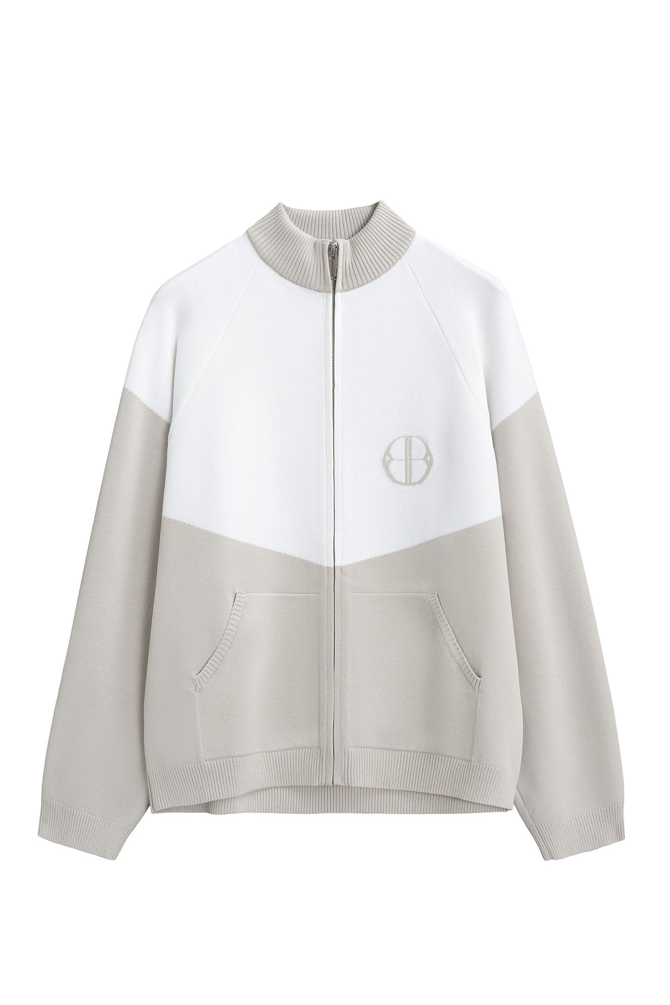 Трикотажный бомбер из вискозы с добавлением эластана. Модель прямого силуэта, с рукавом реглан, невысоким воротником-стойкой и боковыми карманами. Изделие декорировано брендированным жаккардом на груди. Застежка на молнию.
