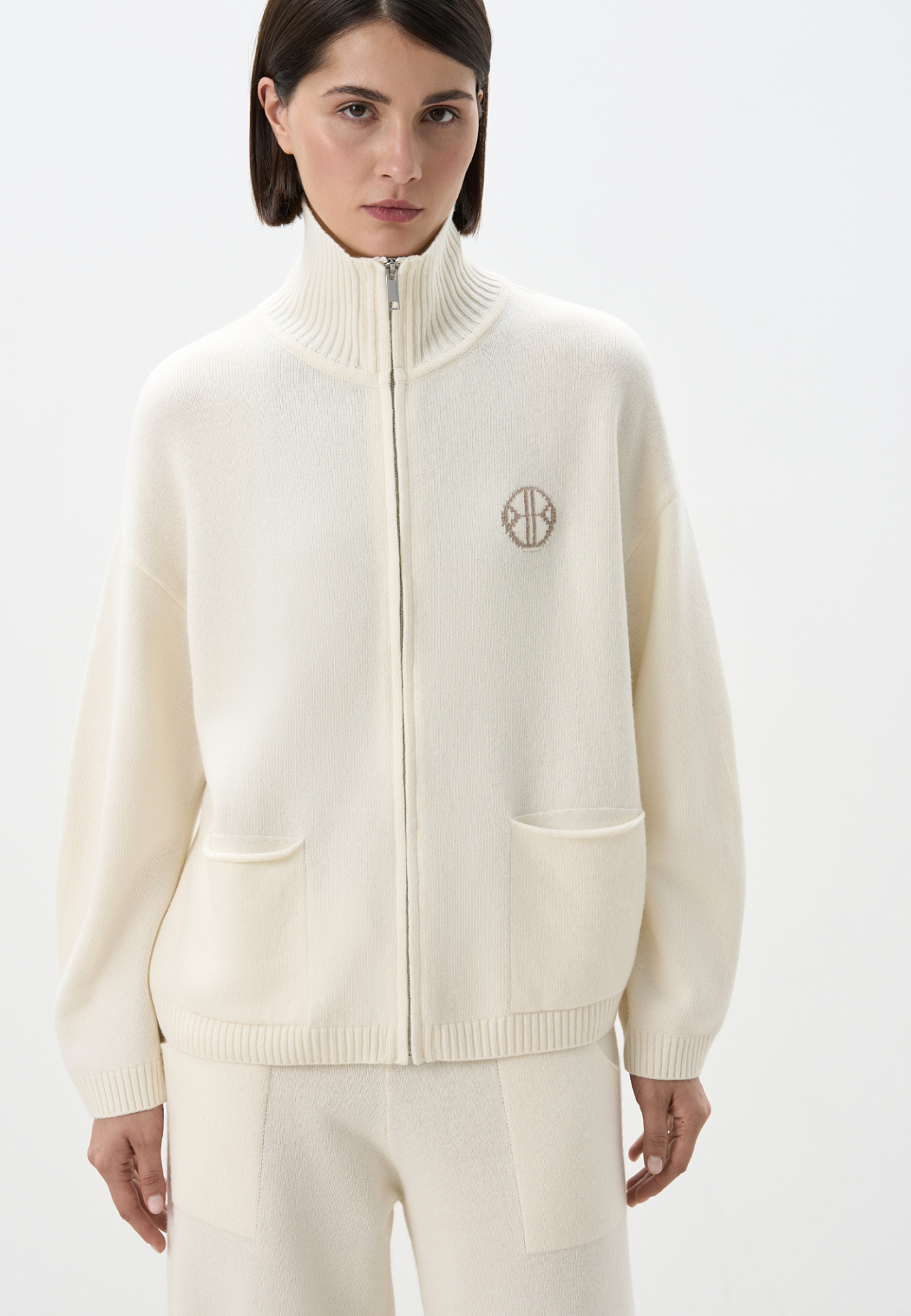Трикотажный бомбер в спортивном стиле из кашемира и шерсти. Модель свободного силуэта со спущенной линией плеча, накладными карманами и воротником-стойкой. Изделие декорировано вышитым логотипом бренда на груди. Застежка на молнию.