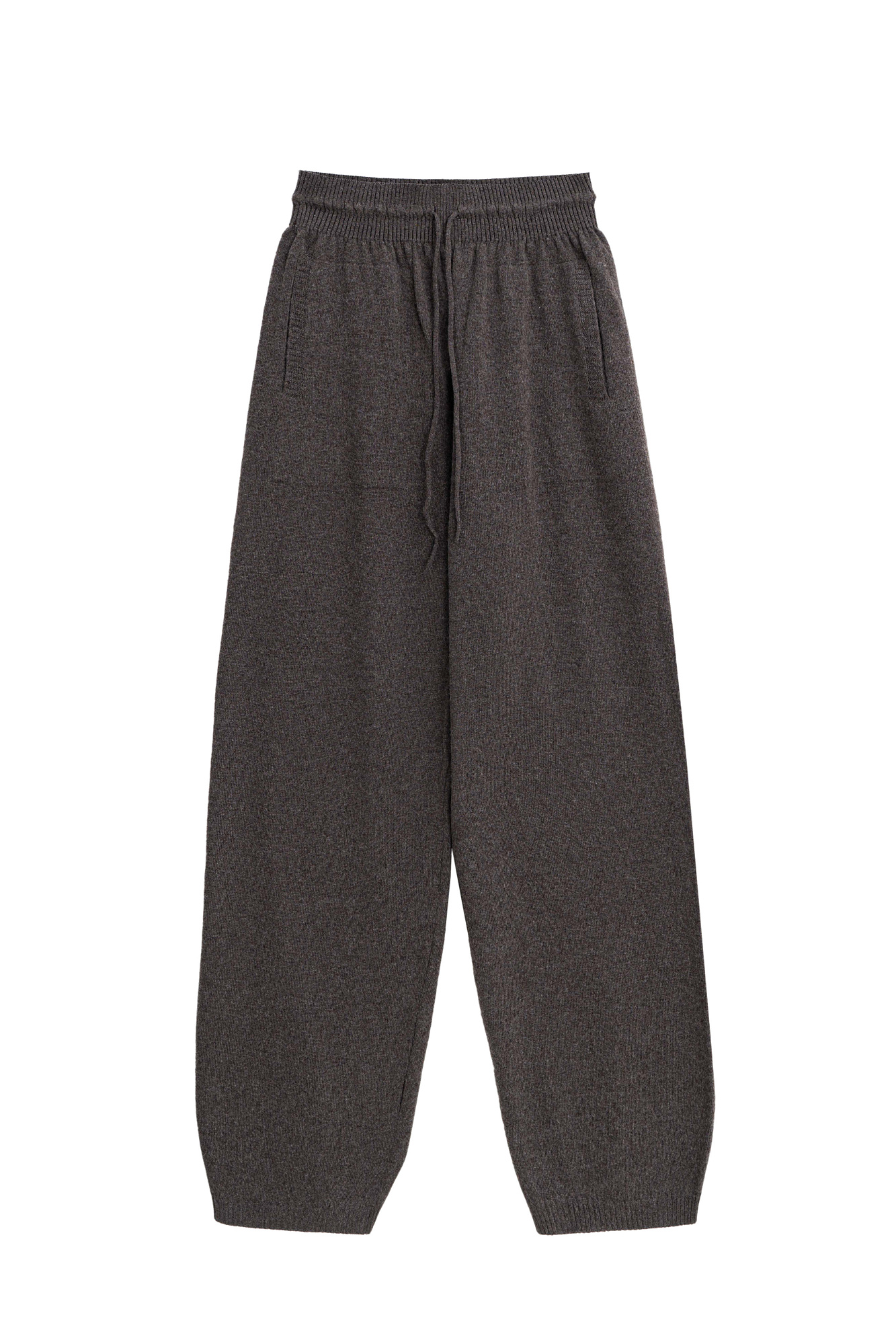 Трикотажные брюки из шерсти с добавлением кашемира. Модель свободного силуэта с эластичным поясом на кулиске и боковыми карманами. Манжеты брюк выполнены в рубчик.