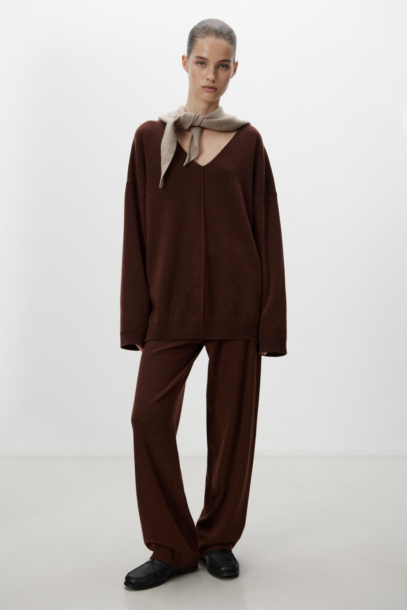 Трикотажные брюки из шерсти с добавлением кашемира. Модель свободного силуэта с эластичным поясом на кулиске и боковыми карманами. Манжеты брюк выполнены в рубчик.