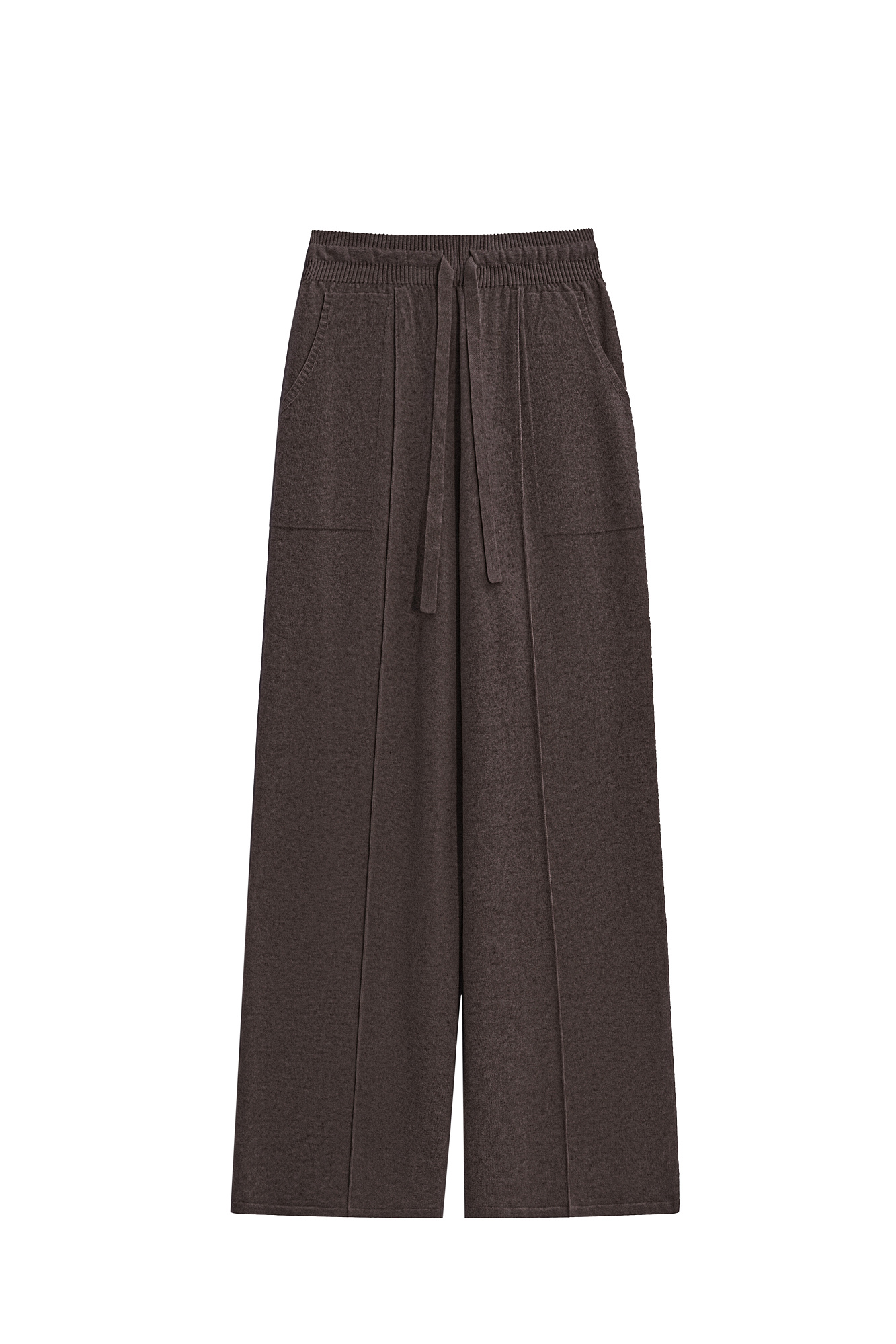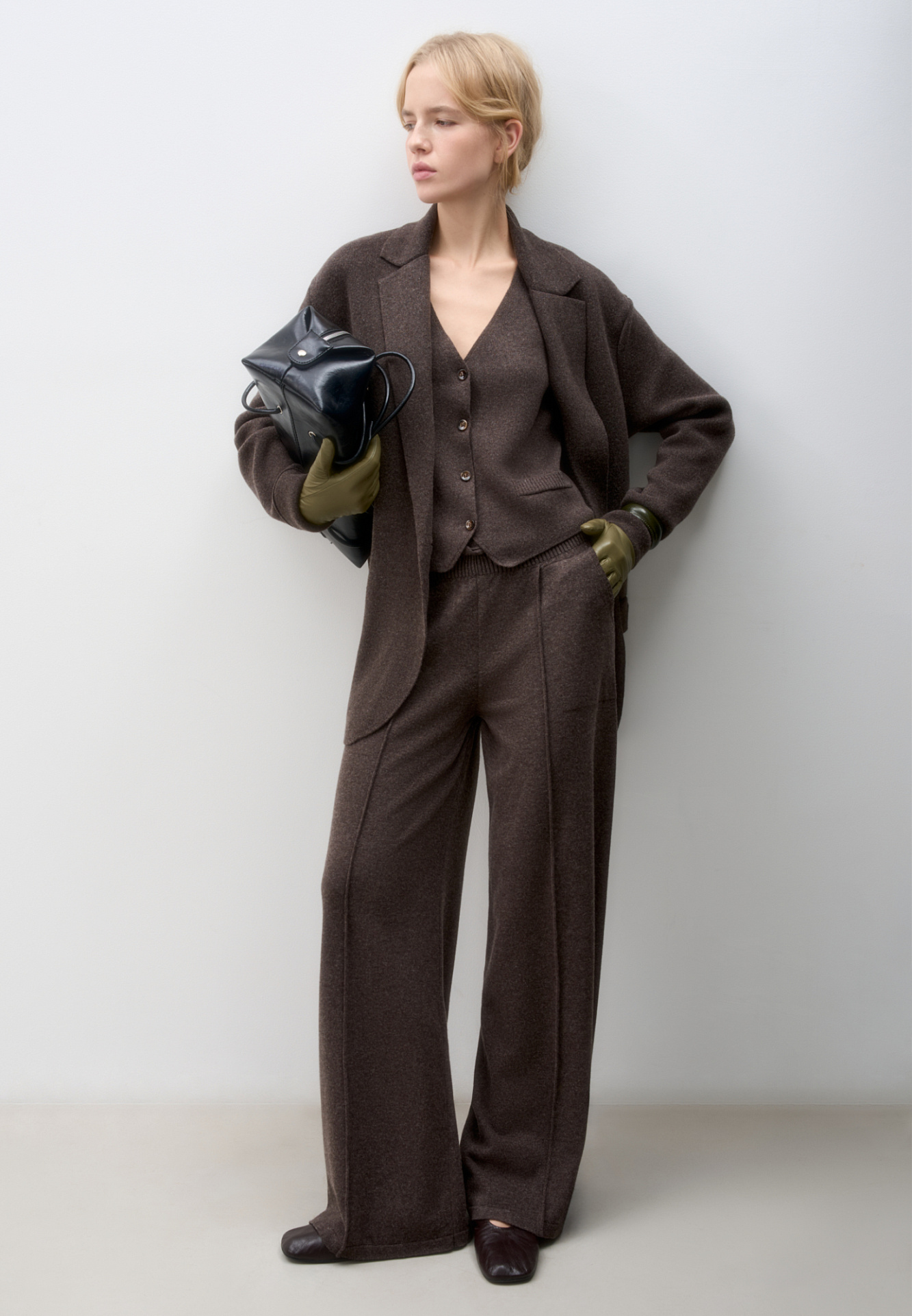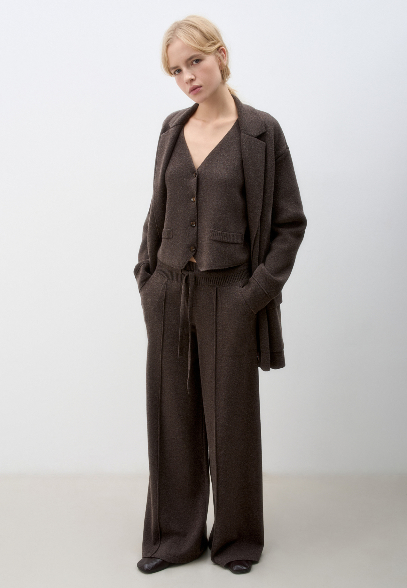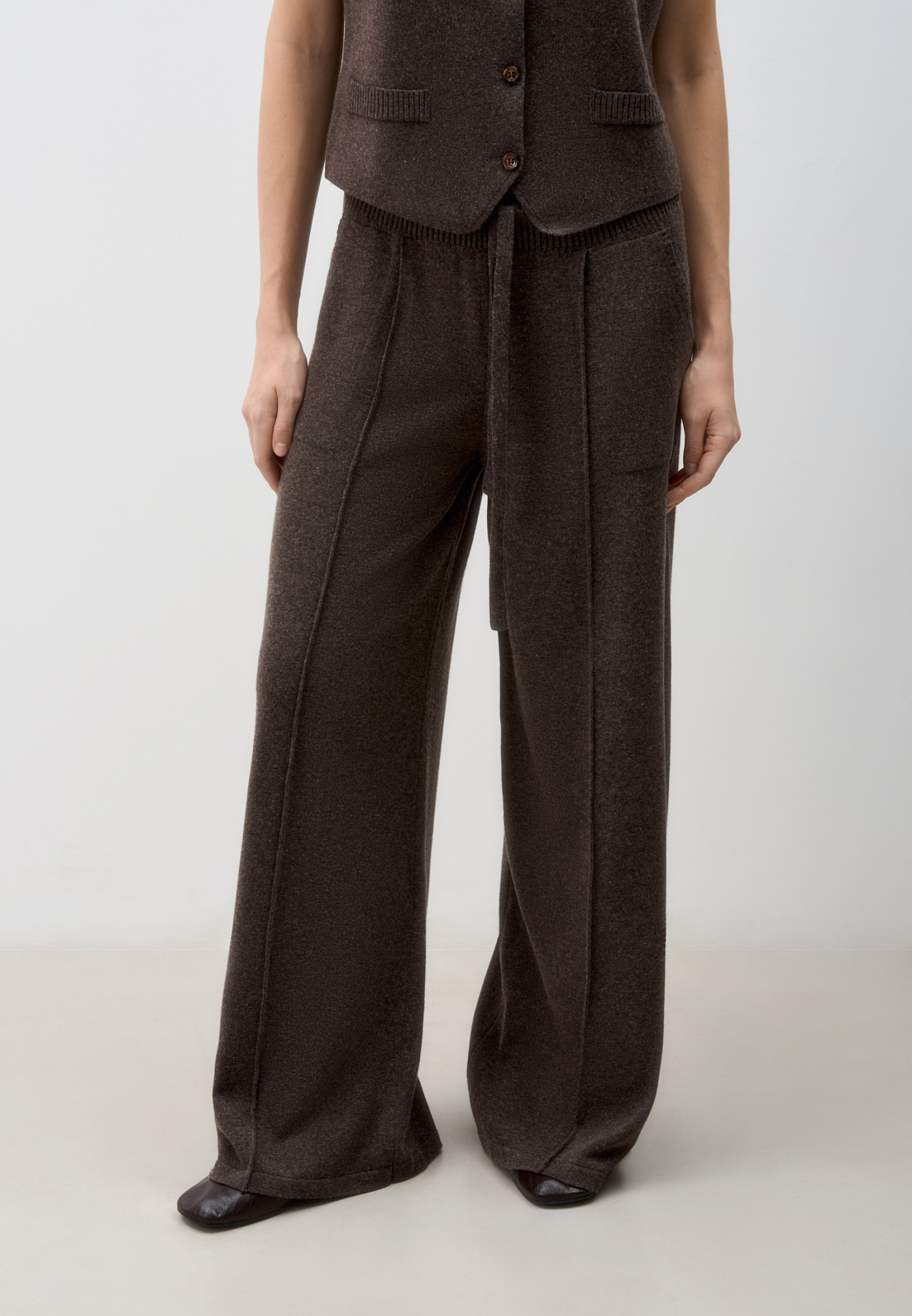 Трикотажные брюки из смесовой шерсти. Модель свободного силуэта со средней посадкой, боковыми карманами и стрелками. Эластичный пояс на кулиске в рубчик.