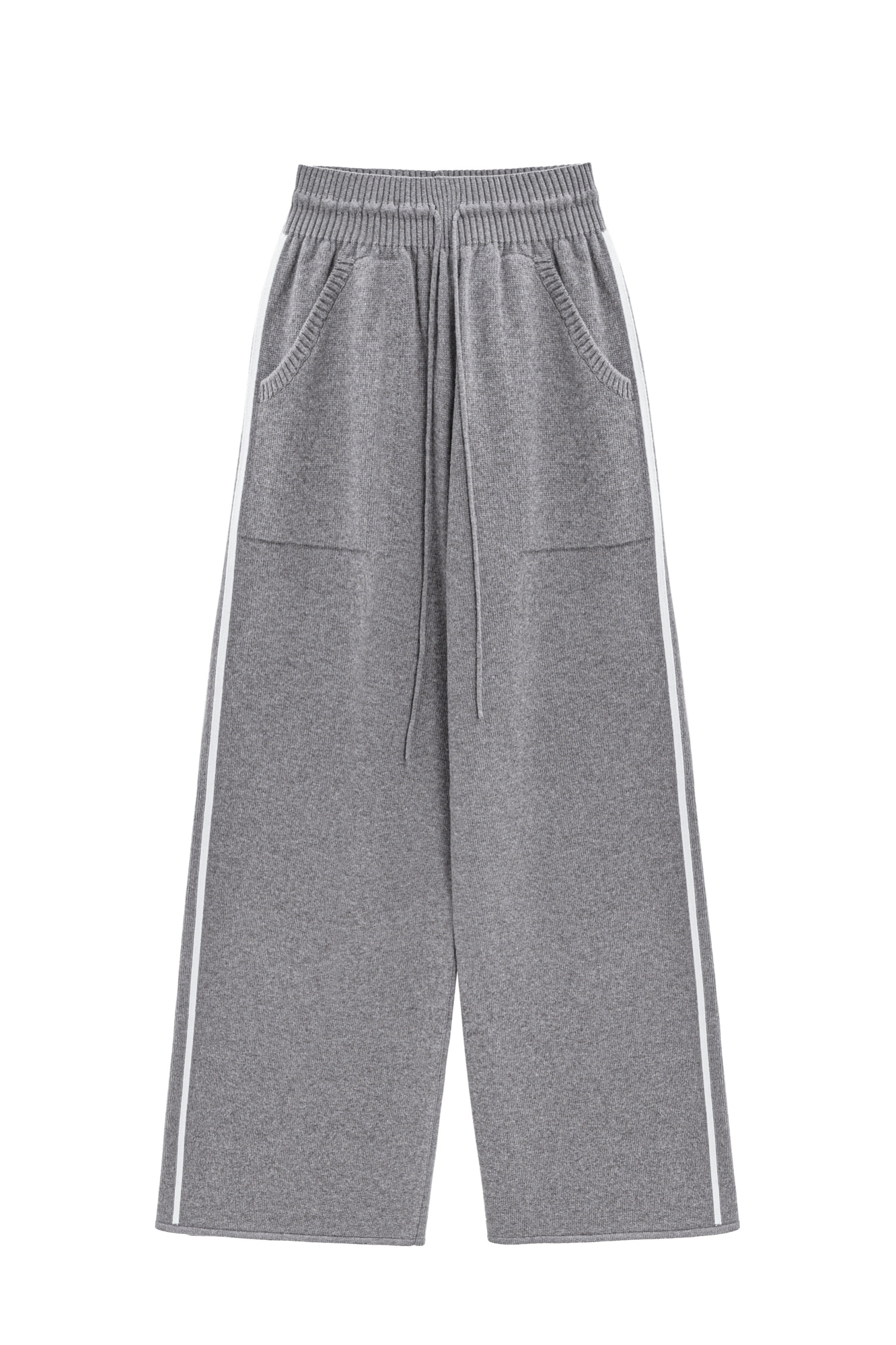Трикотажные брюки из кашемира и шерсти. Модель свободного силуэта со средней посадкой, боковыми вывязанными карманами и эластичным поясом на кулиске. Изделие декорировано лампасами контрастного цвета.