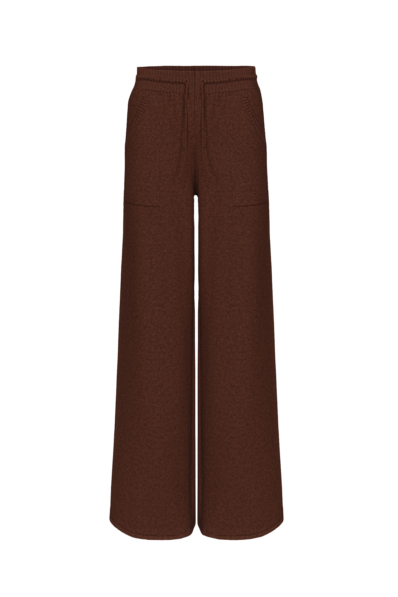 Трикотажные брюки из кашемира и шерсти. Модель свободного силуэта со средней посадкой, боковыми вывязанными карманами и эластичным поясом на кулиске. Изделие декорировано лампасами контрастного цвета.