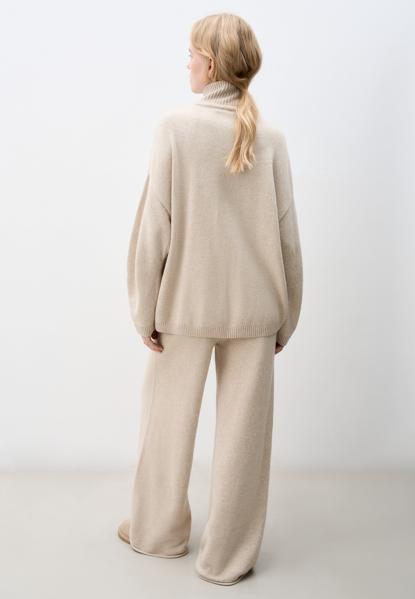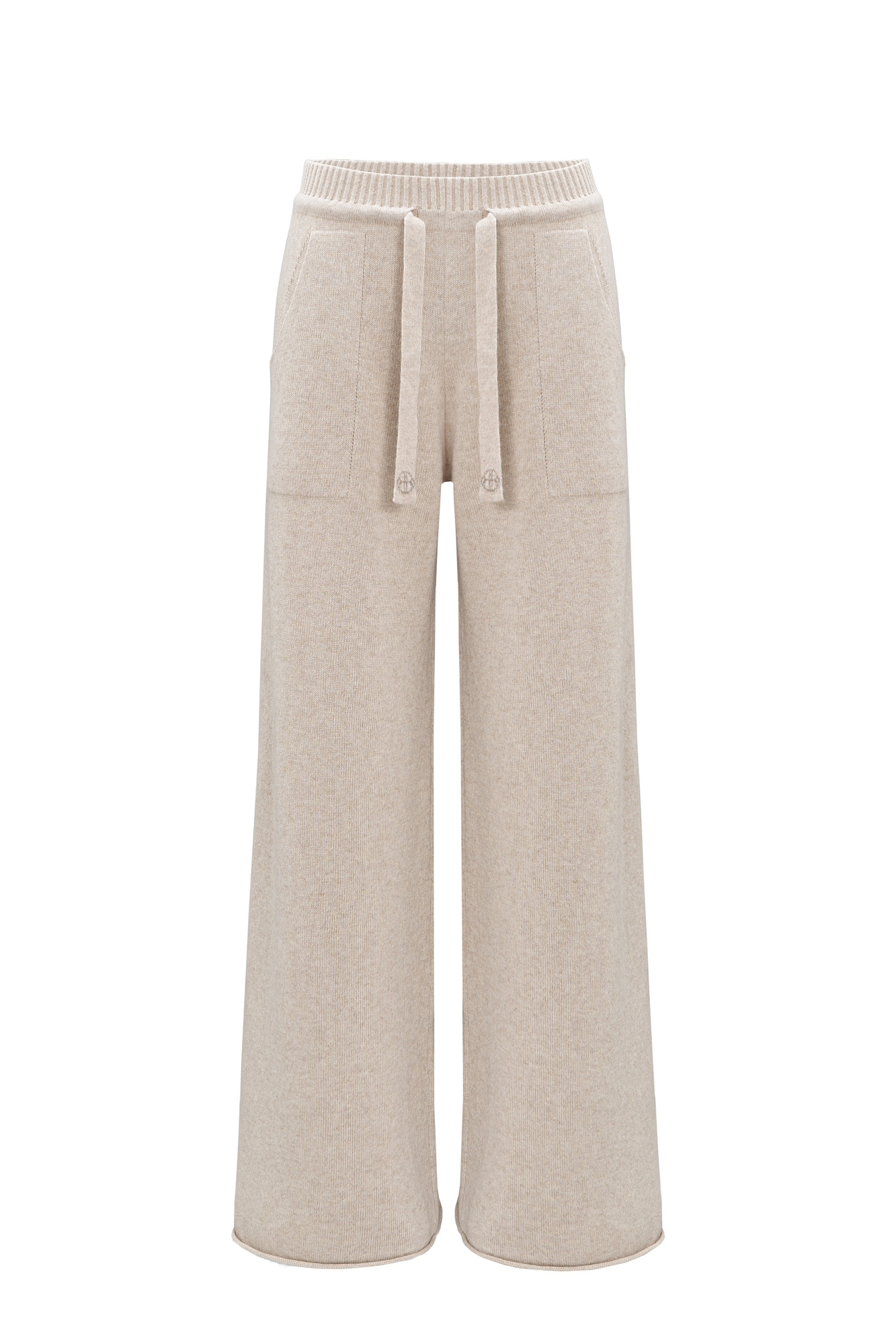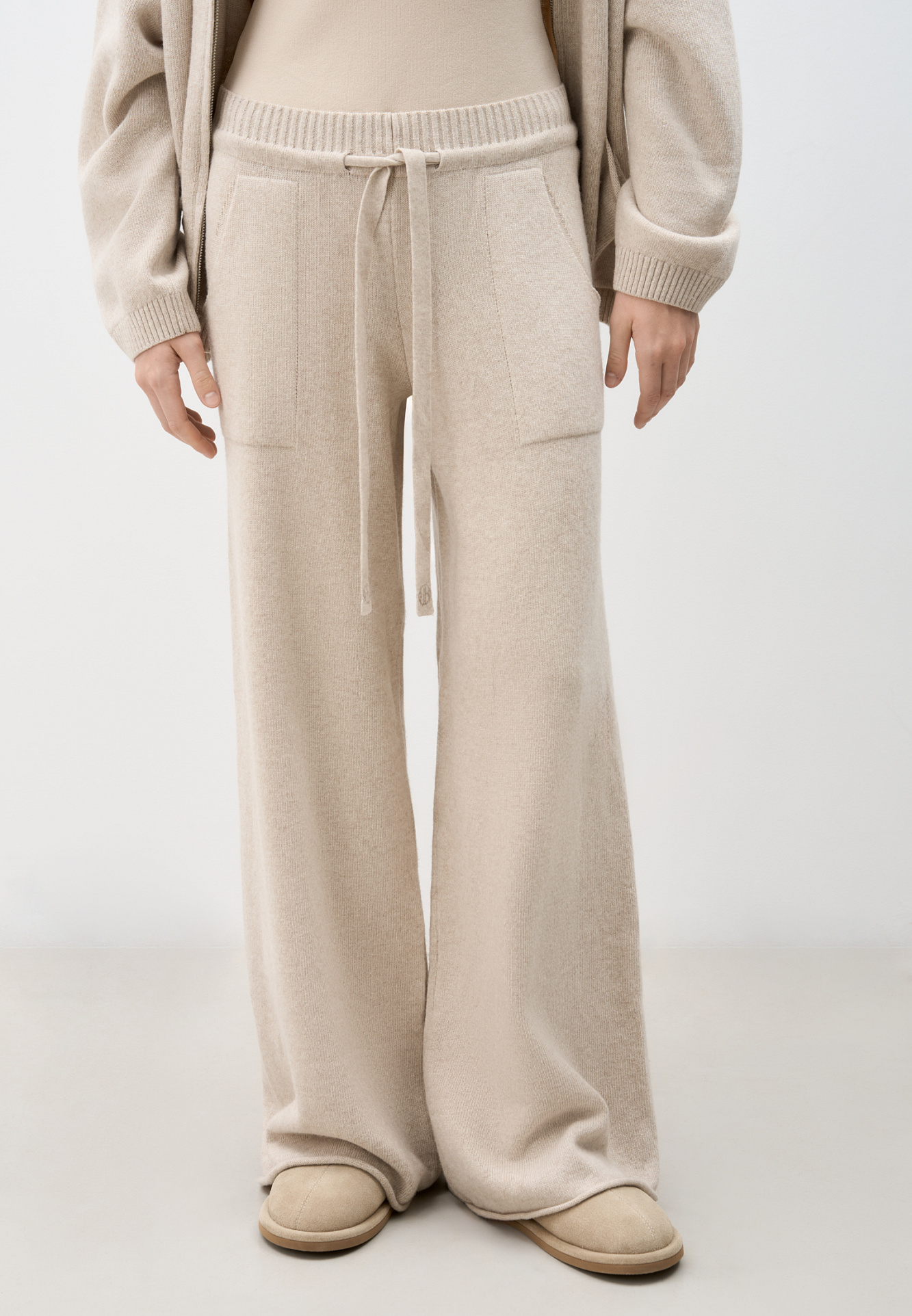 Трикотажные брюки из кашемира и шерсти. Модель прямого силуэта с накладными карманами и эластичным поясом в рубчик на кулиске. Дополнить образ можно бомбером.