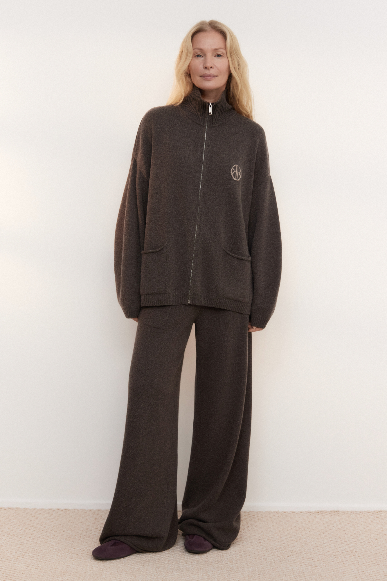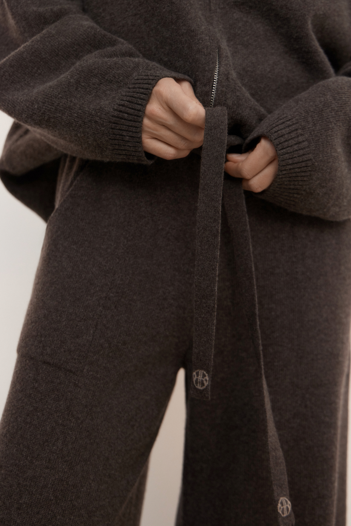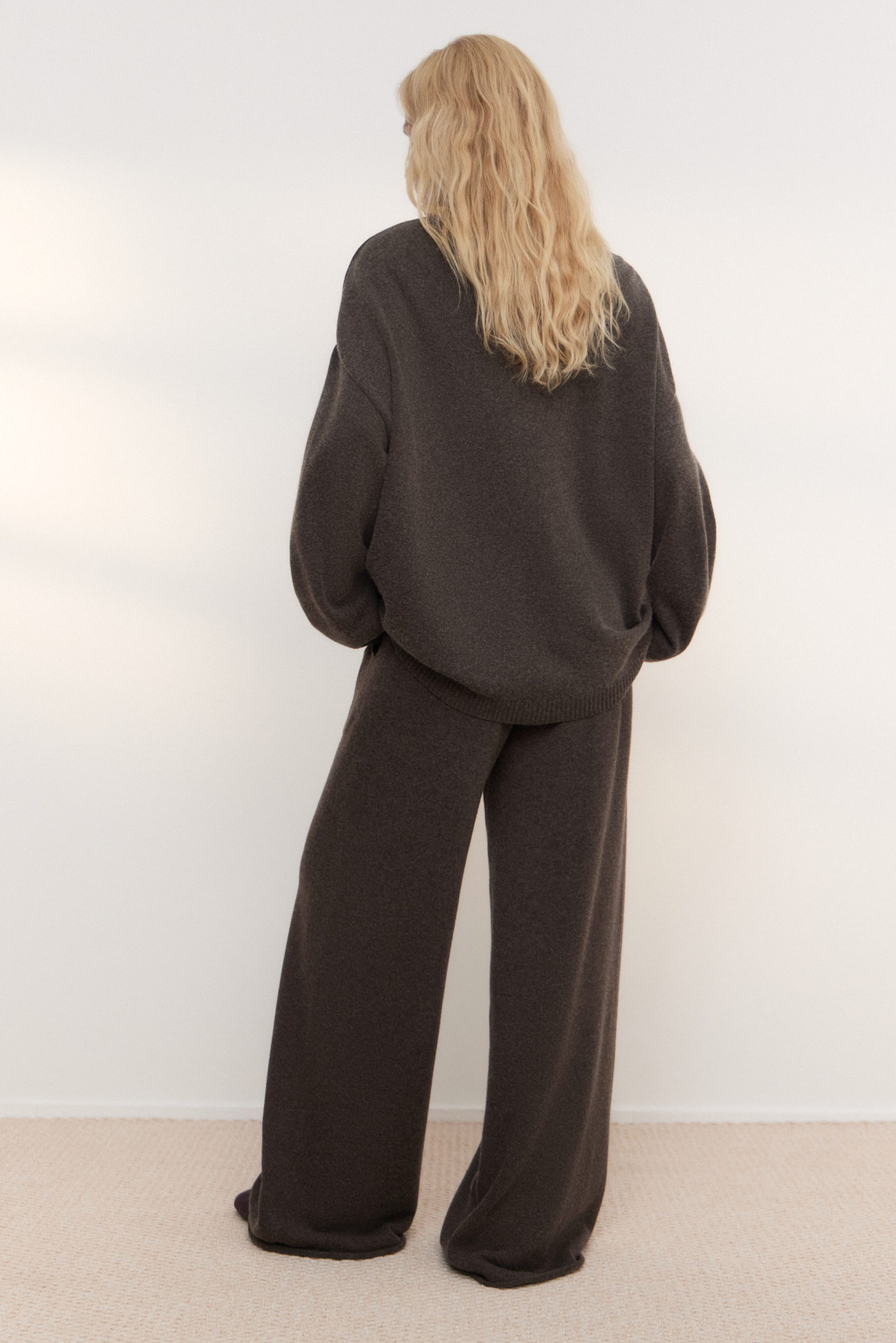 Трикотажные брюки из кашемира и шерсти. Модель прямого силуэта с накладными карманами и эластичным поясом в рубчик на кулиске. Дополнить образ можно бомбером.