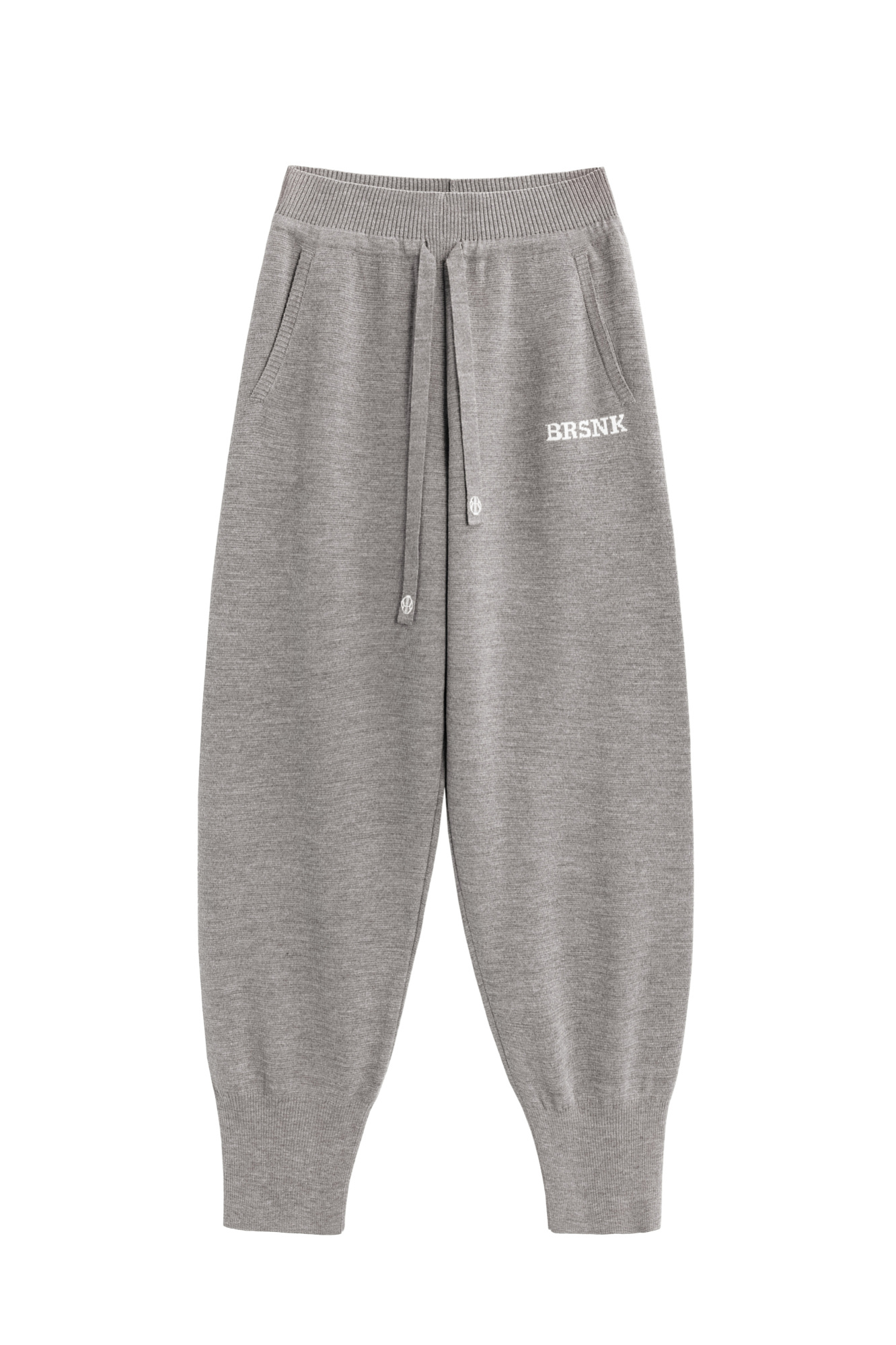 Трикотажные брюки из шерсти с добавлением акрила. Модель выполнена в спортивном стиле, с широким эластичным поясом на кулиске, боковыми карманами и широкими манжетами на резинке. Изделие декорировано брендированным жаккардом на штанине.
