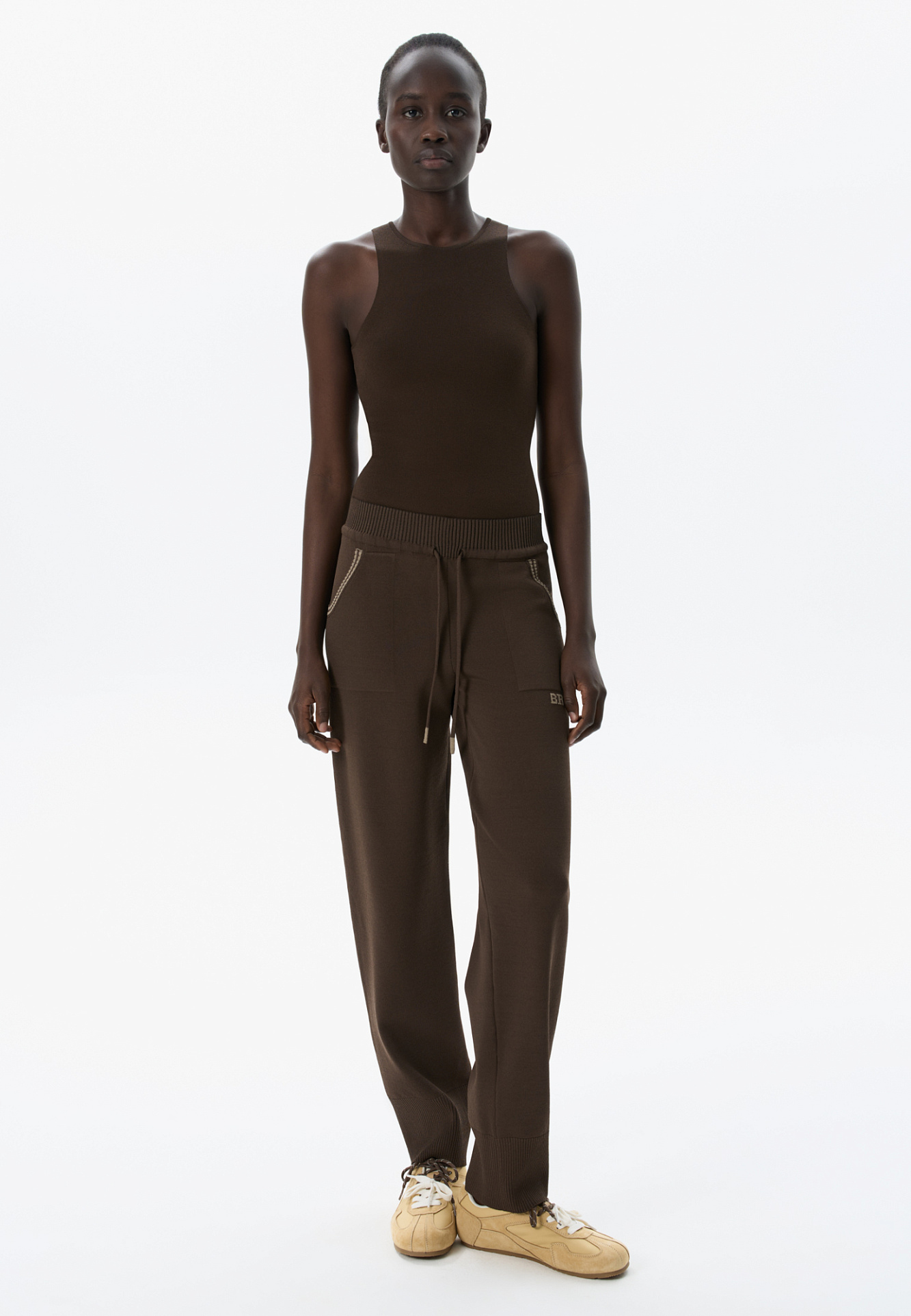 Трикотажные брюки из вискозы с добавлением эластана. Модель выполнена в спортивном стиле, с широким эластичным поясом на кулиске, боковыми карманами и широкими манжетами на резинке.